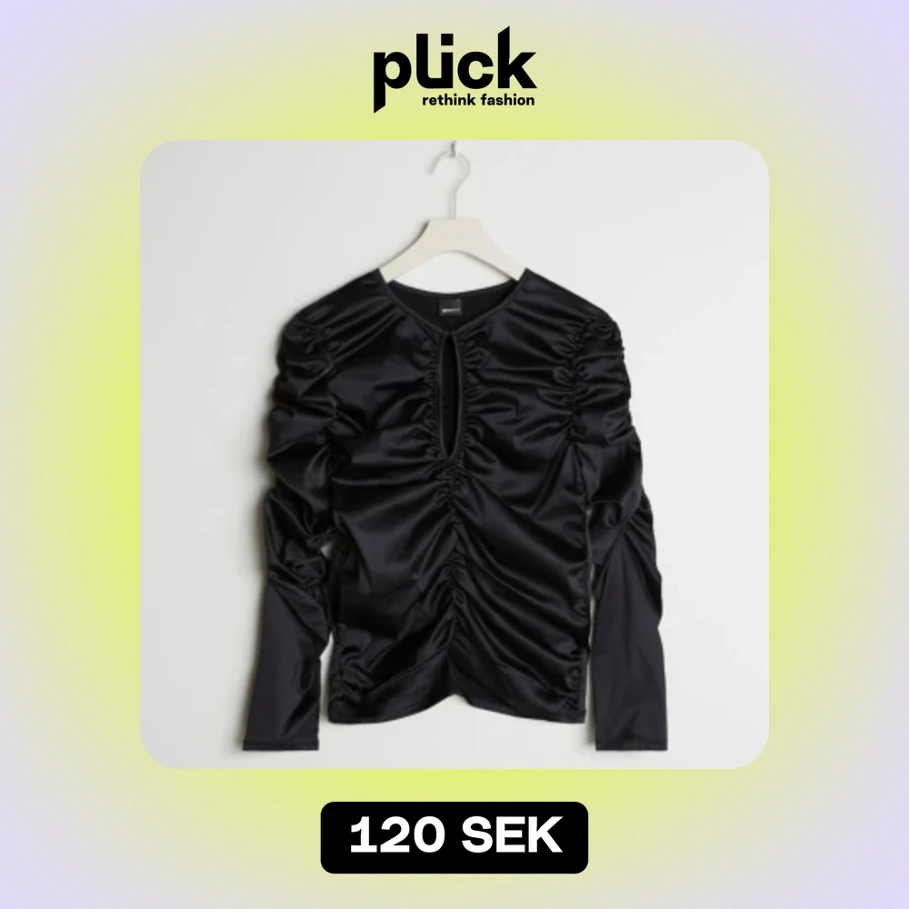 Snygg svart blus i satin från Ginatricot med rynkdetaljer som ger en cool look. Den har en liten öppning framtill och långa ärmar. Perfekt för en kväll ute eller en festlig tillställning!