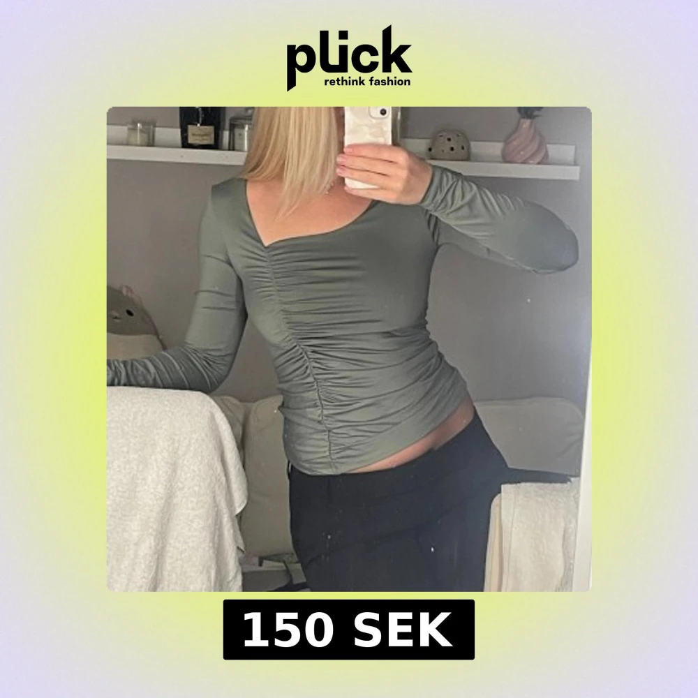 Säljer en grön långärmad topp från Amisu med v-ringning och snygga rynkdetaljer framtill. Toppen har en tight passform och är tillverkad i ett mjukt, stretchigt material som sitter skönt på kroppen.