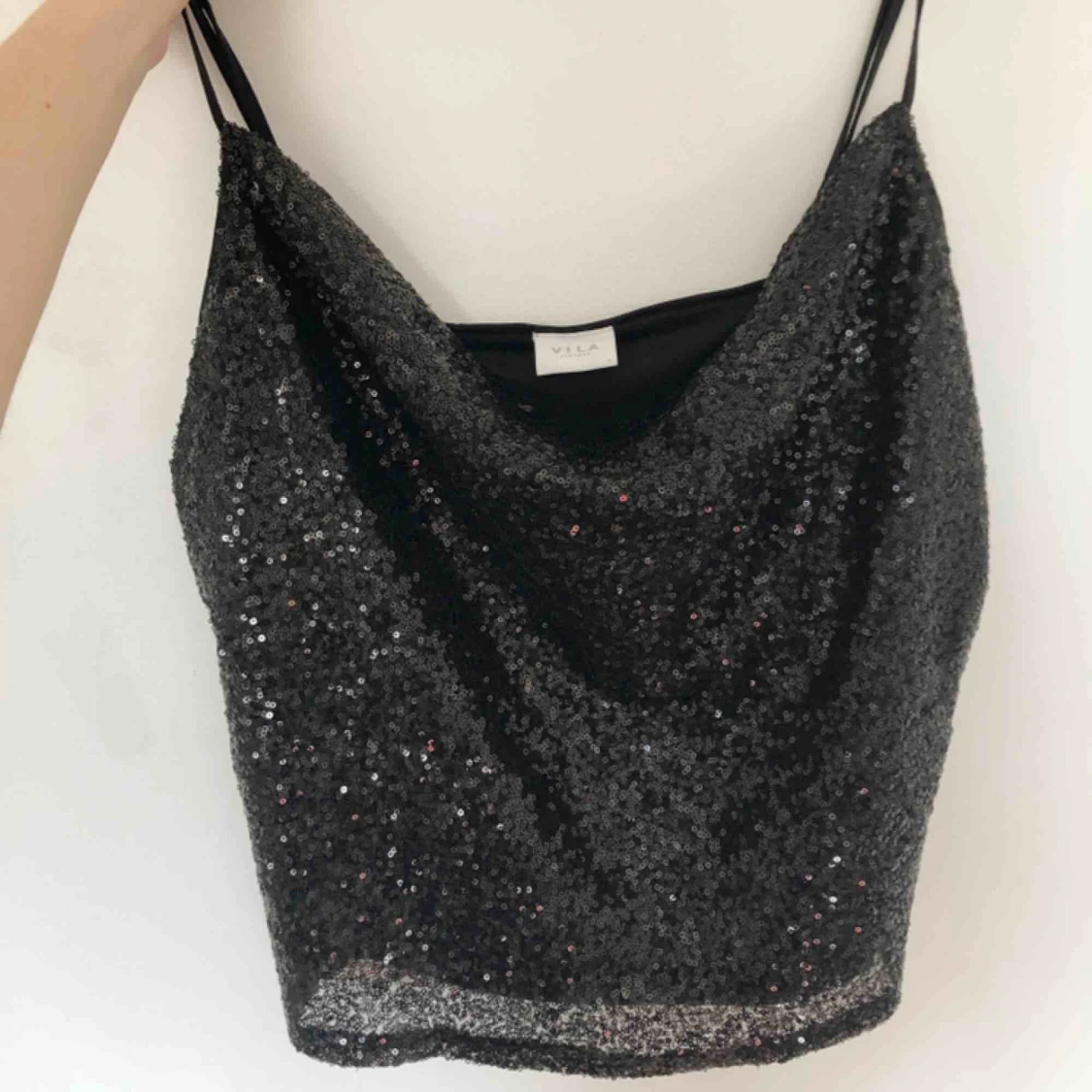 Säljer detta skitsnygga svarta paljettlinne med draperad halsringning, använd endast en gång ✨ Säljer pga att den är alldeles för stor för mig! Köpt på Vila i Jkpg för 260kr och säljer den för 160kr, köparen står för frakten 💫☺️