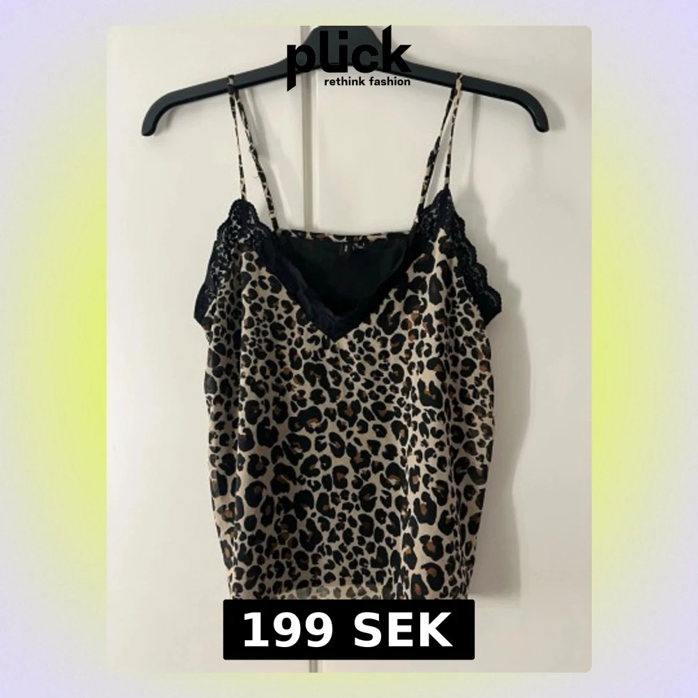 Snygg leopardmönstrad linnetopp med tunna axelband och svart spetsdetalj vid v-ringningen. Perfekt för dig som vill sticka ut och addera lite edge till din outfit. Luftigt material och trendig look.