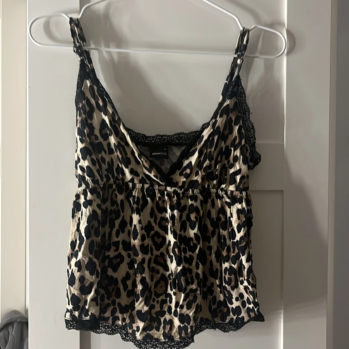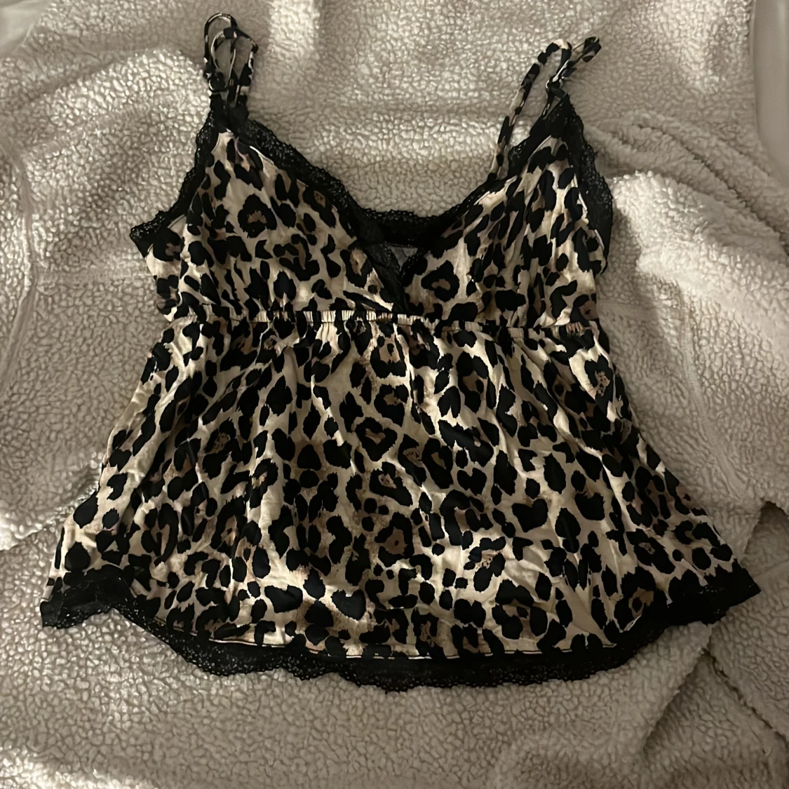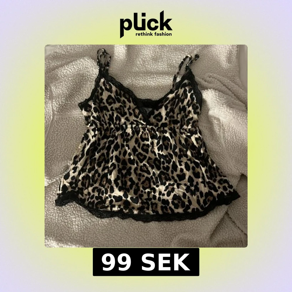 Säljer en snygg linnetopp från Gina Tricot med leopardmönster i beige och svart. Toppen har tunna axelband, v-ringning och svarta spetsdetaljer längs kanterna. Materialet är glansigt och känns lyxigt mot huden. Perfekt för dig som vill sticka ut lite extra.
