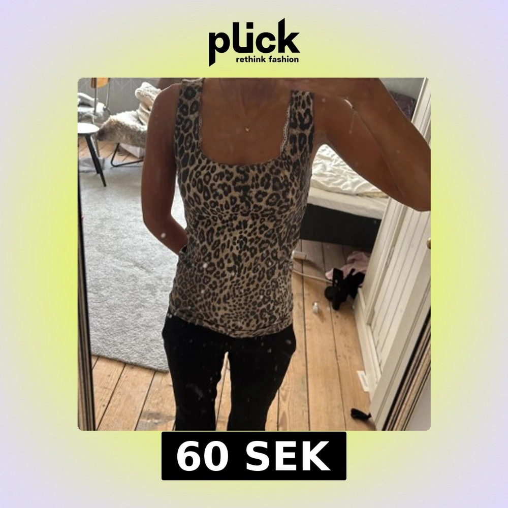 Snygg ärmlös linnetopp med leopardmönster och fyrkantig ringning. Toppen har en beige och svart färgskala och en liten spetsdetalj vid halsringningen. Perfekt för dig som vill sticka ut med ett djurmönster.