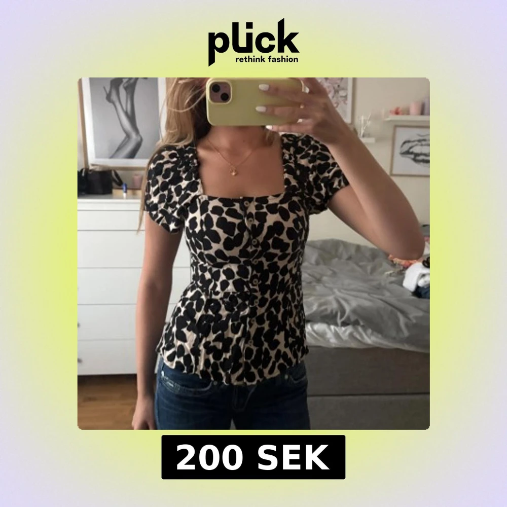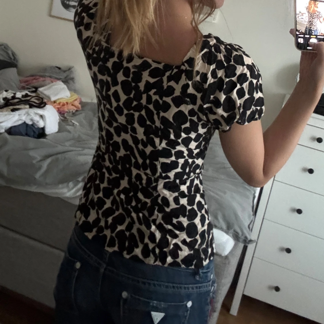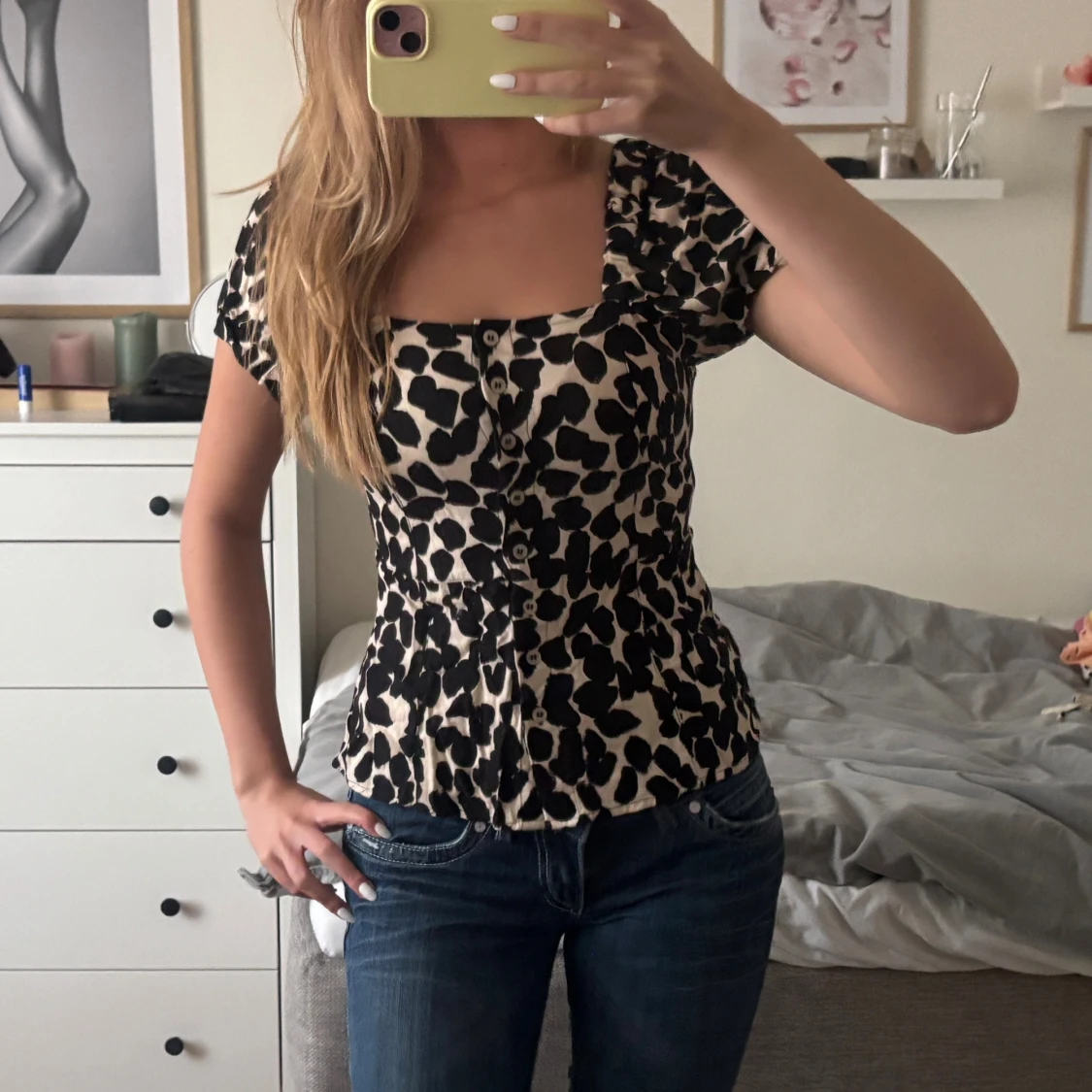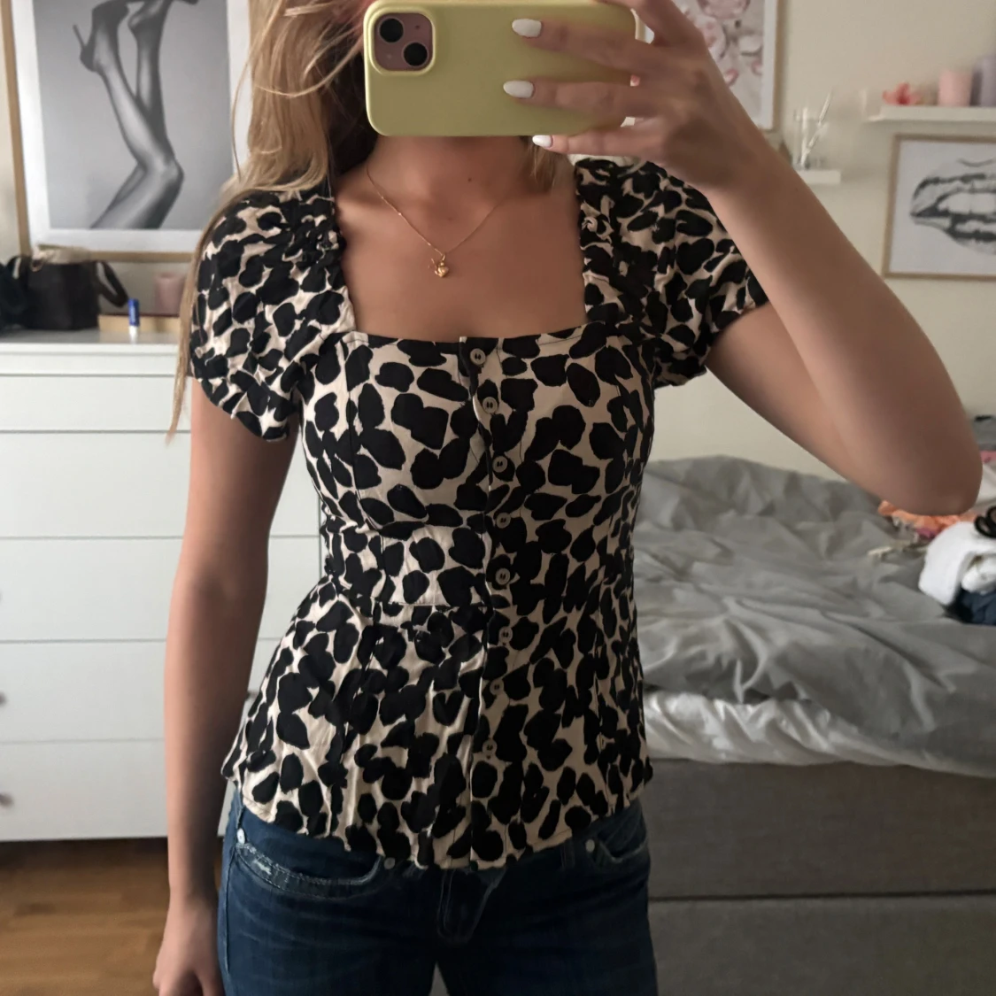 Supersnygg blus med svart leopardmönster på beige botten. Blusen har korta puffärmar, markerad midja och knappar framtill. Fyrkantig urringning ger en trendig vibe och materialet känns lätt och bekvämt.