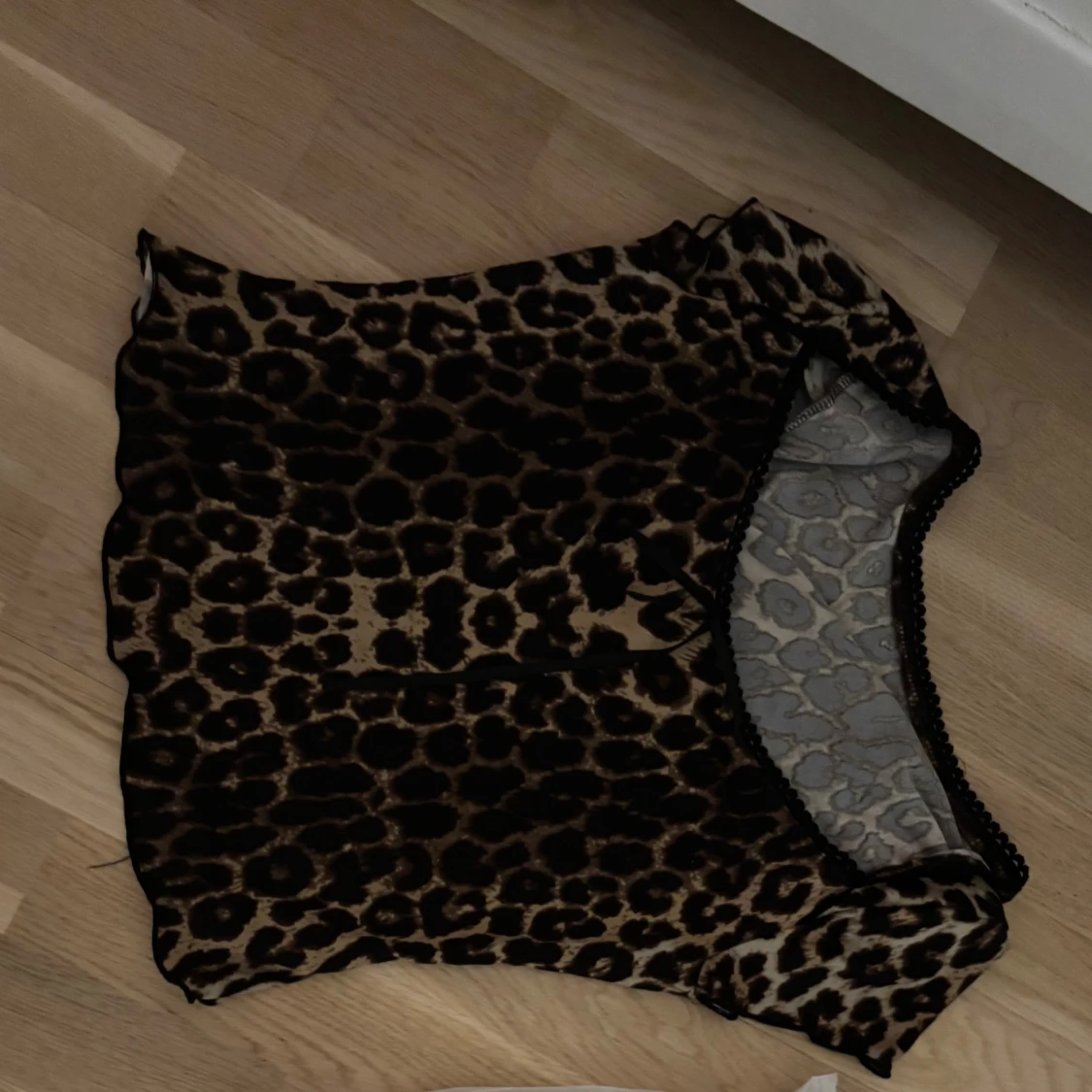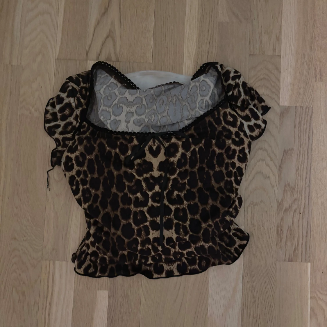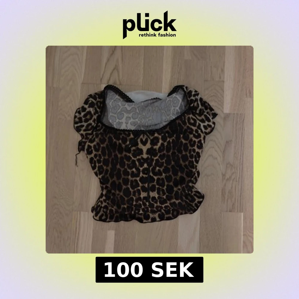 Säljer en leopardmönstrad blus med korta puffärmar och volangkant. Toppen har en rundad hals med svart spetsdetalj och är gjord i ett lätt, transparent syntetmaterial. Perfekt för dig som vill sticka ut med ett djuriskt mönster. Köpt här på plick. Köptes för 150. Måste verkligen bli av med kläder så lägg gärna ett prisförslag om ni är intresserade, är öppen för alla rimliga priser💗💗