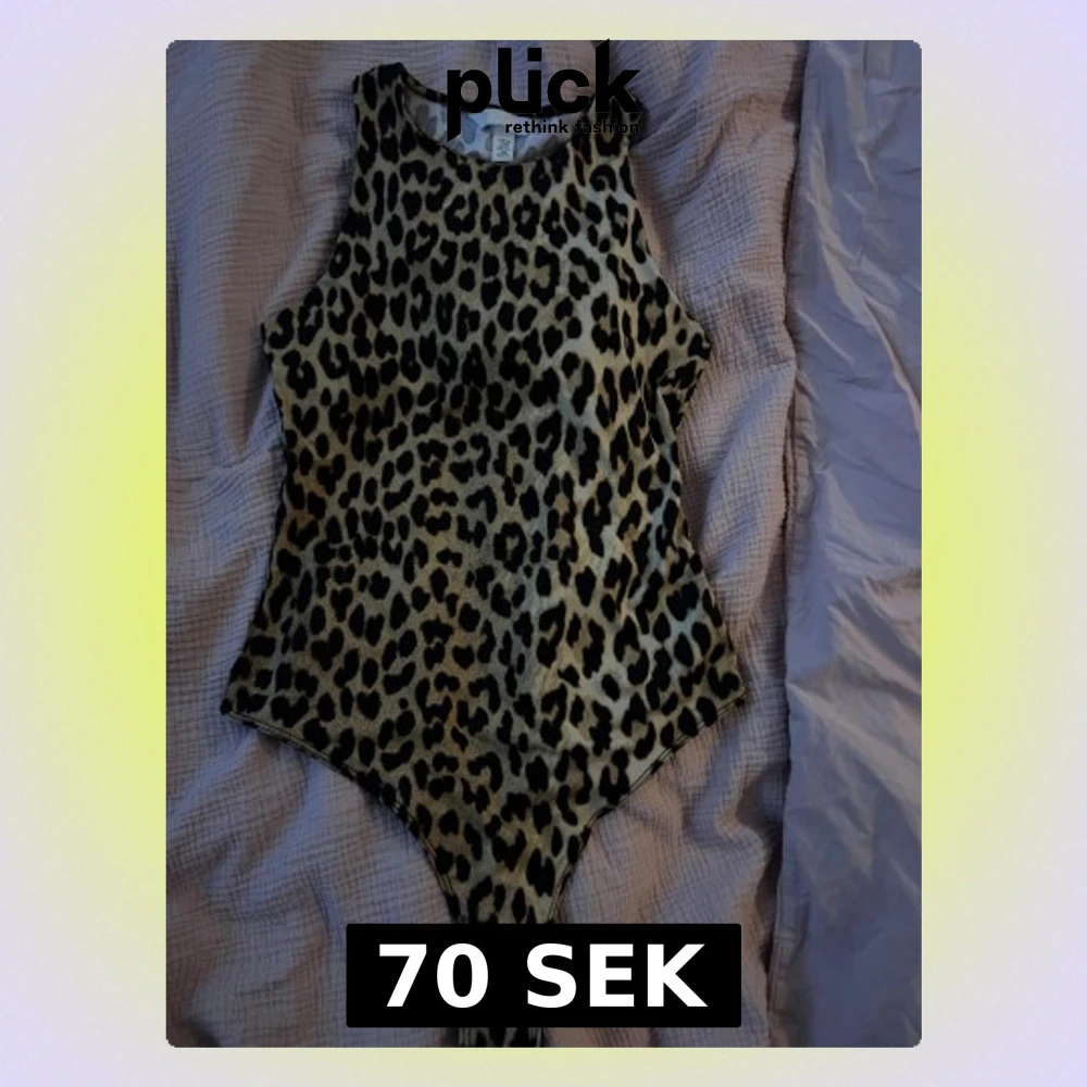 Säljer en leopardmönstrad bodysuit från H&M i beige och svart. Modellen är ärmlös med hög hals och smal passform. Materialet är mjukt och stretchigt polyester som sitter snyggt mot kroppen. Den är i storlek xs.