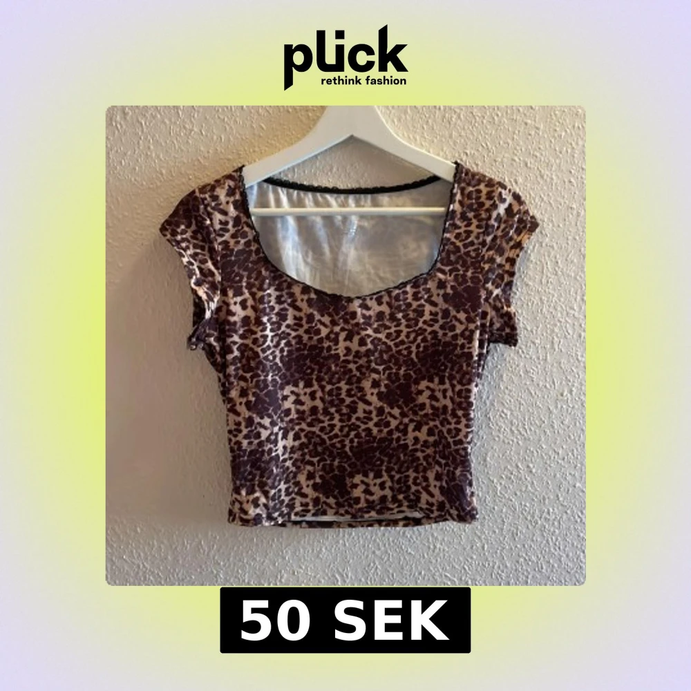 Säljer en croppad topp med leopardmönster i bruna och beige toner. Toppen har korta ärmar, fyrkantig ringning med svart spetskant.