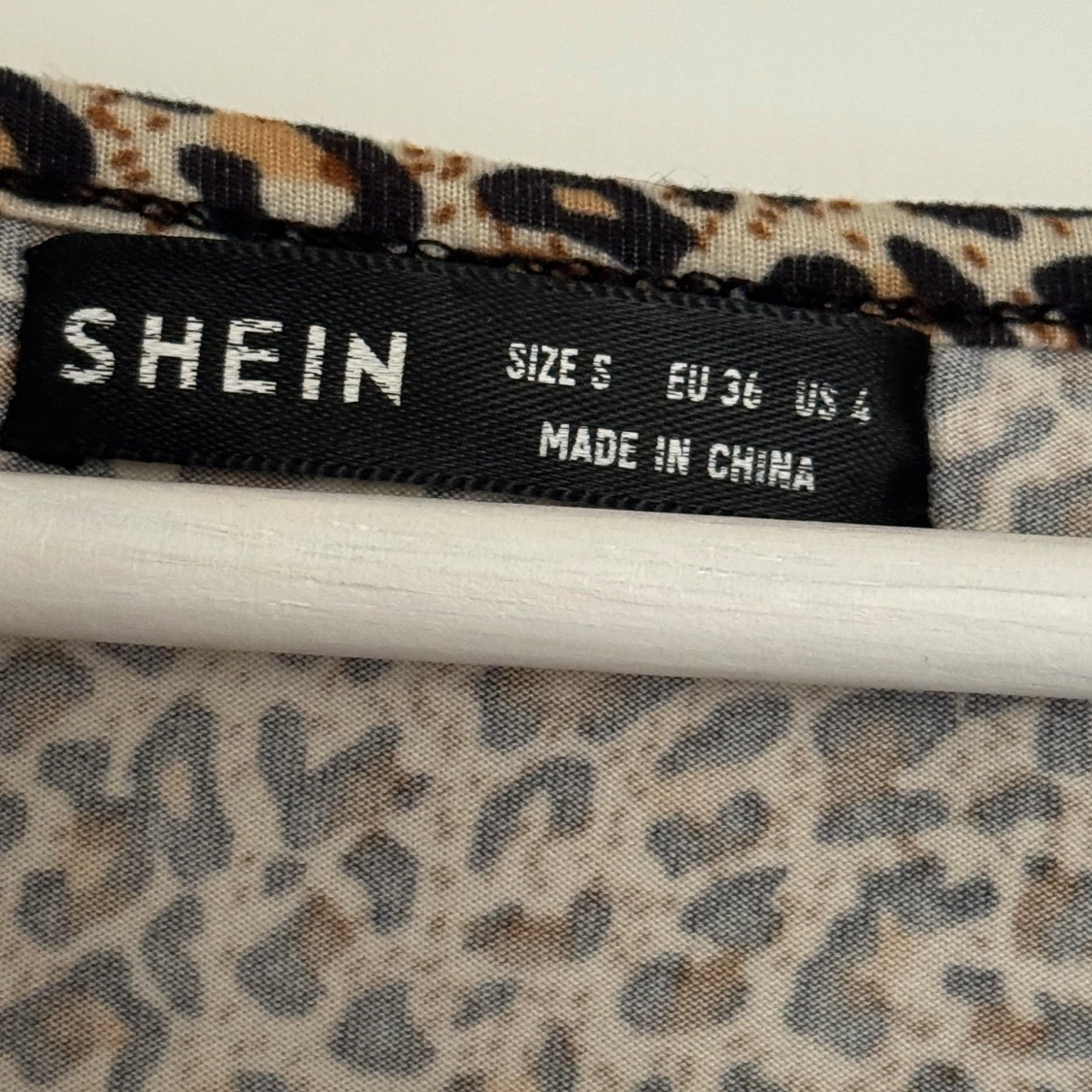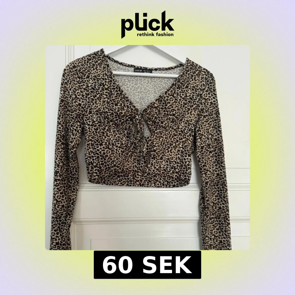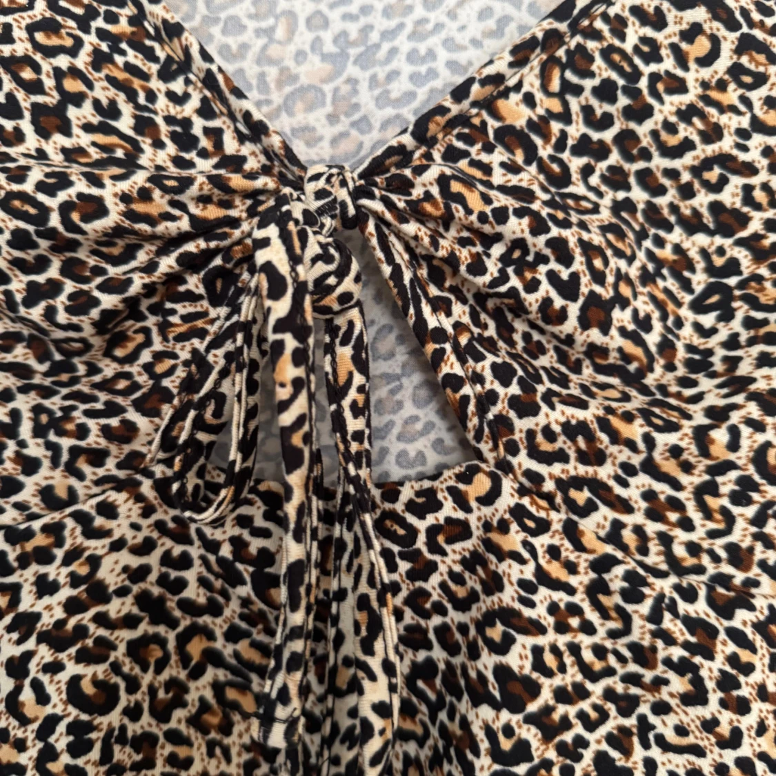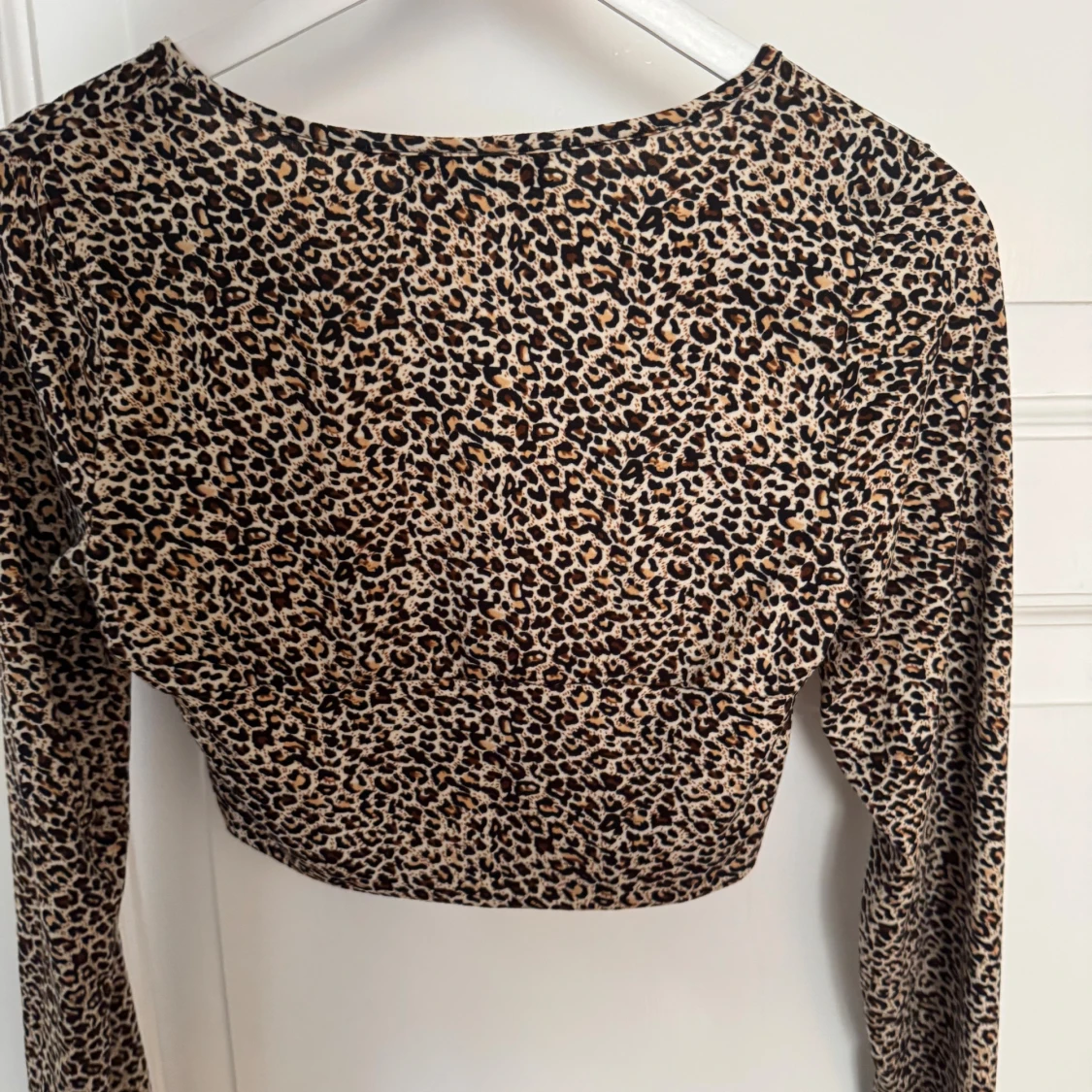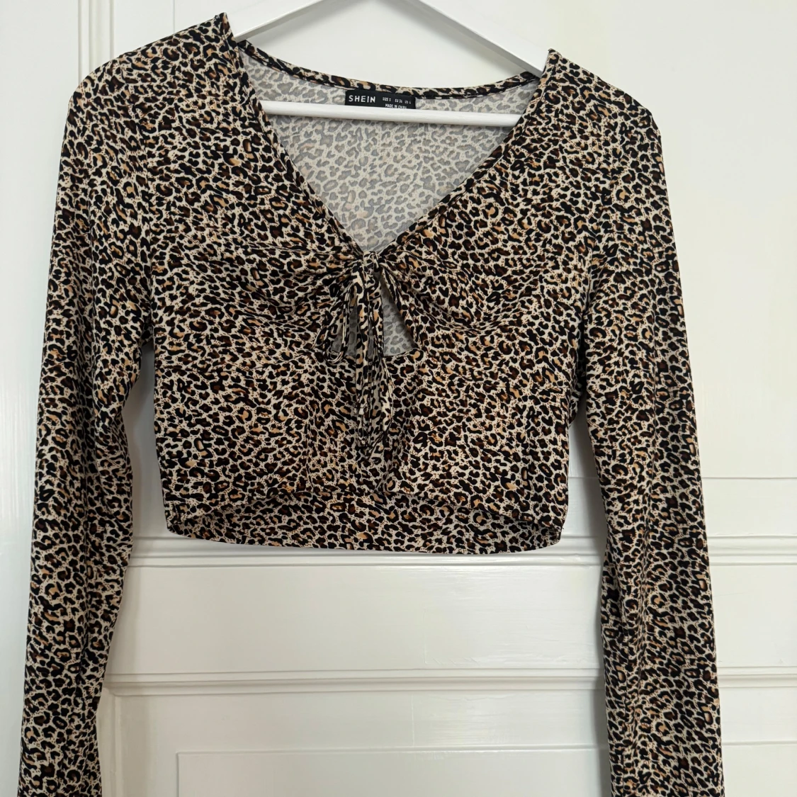 Säljer en croppad långärmad topp från Shein med leopardmönster i beige, brunt och svart. Toppen har v-ringning och snygg knytning framtill. Perfekt för dig som vill sticka ut med ett djurmönstrat plagg.