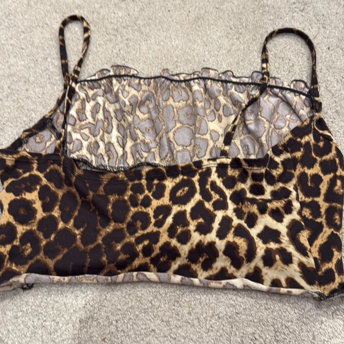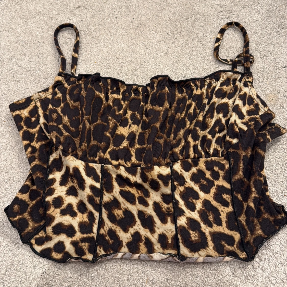 Säljer en snygg leopardmönstrad korsett-topp med smala axelband och figurnära passform. Toppen har bruna och beige toner och är tillverkad i ett stretchigt syntetmaterial. Perfekt för dig som vill sticka ut med ett djurmönster och trendig look.
