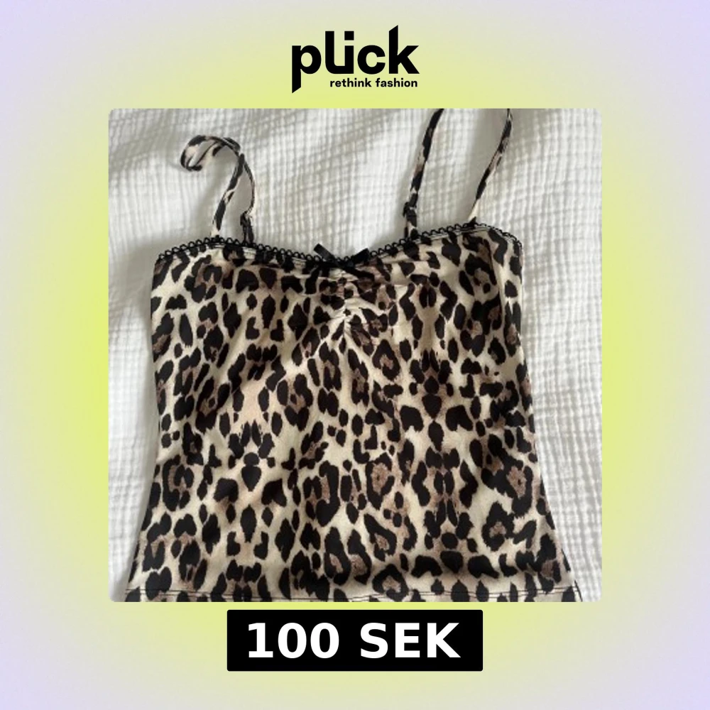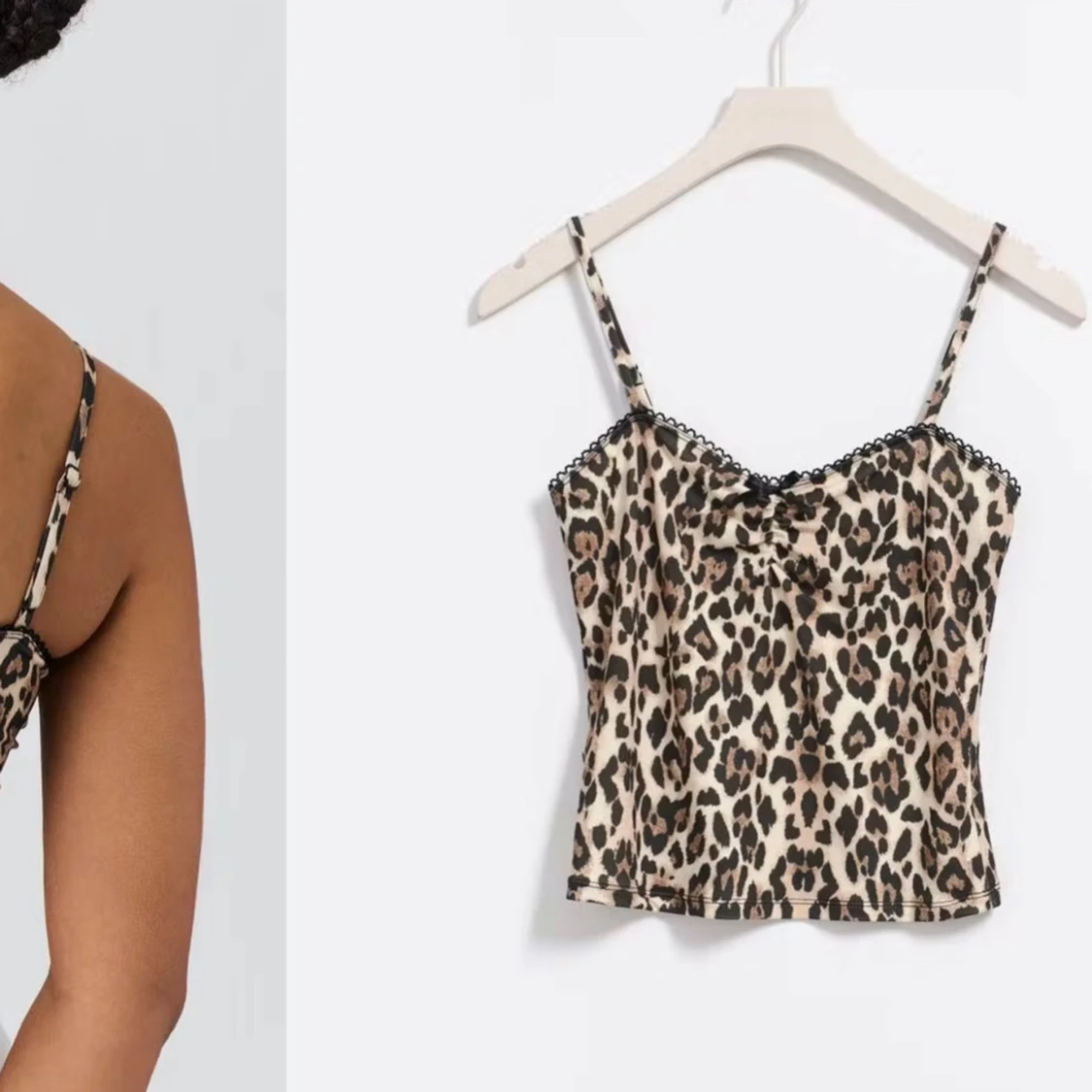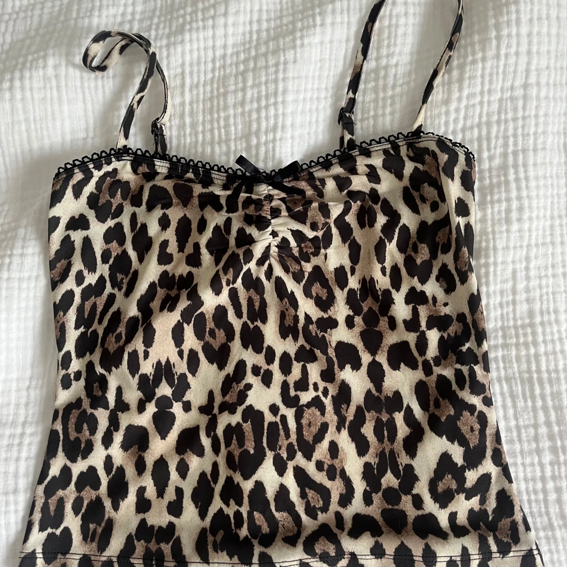 Snygg leopardmönstrad linne med tunna justerbara axelband och liten svart rosett framtill. Toppen har spetskant längs urringningen, aldrig använt!
