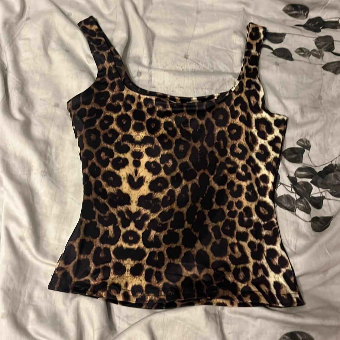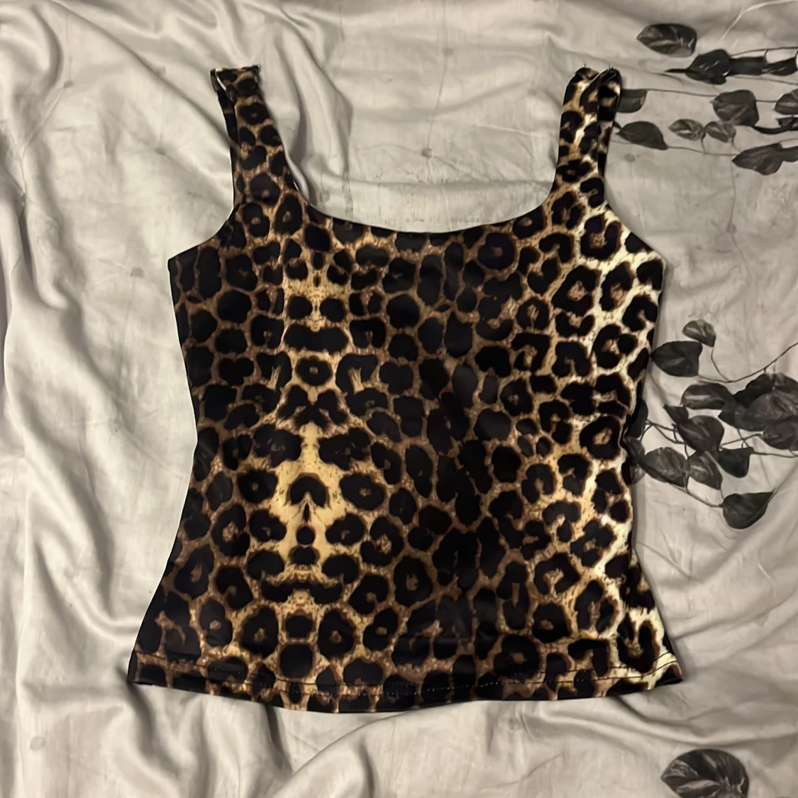Säljer en snygg linne-topp med leopardmönster i bruna och svarta toner. Toppen har breda axelband och är figurnära med stretchigt material. Perfekt för dig som vill sticka ut med ett djurmönster och addera lite edge till din outfit.