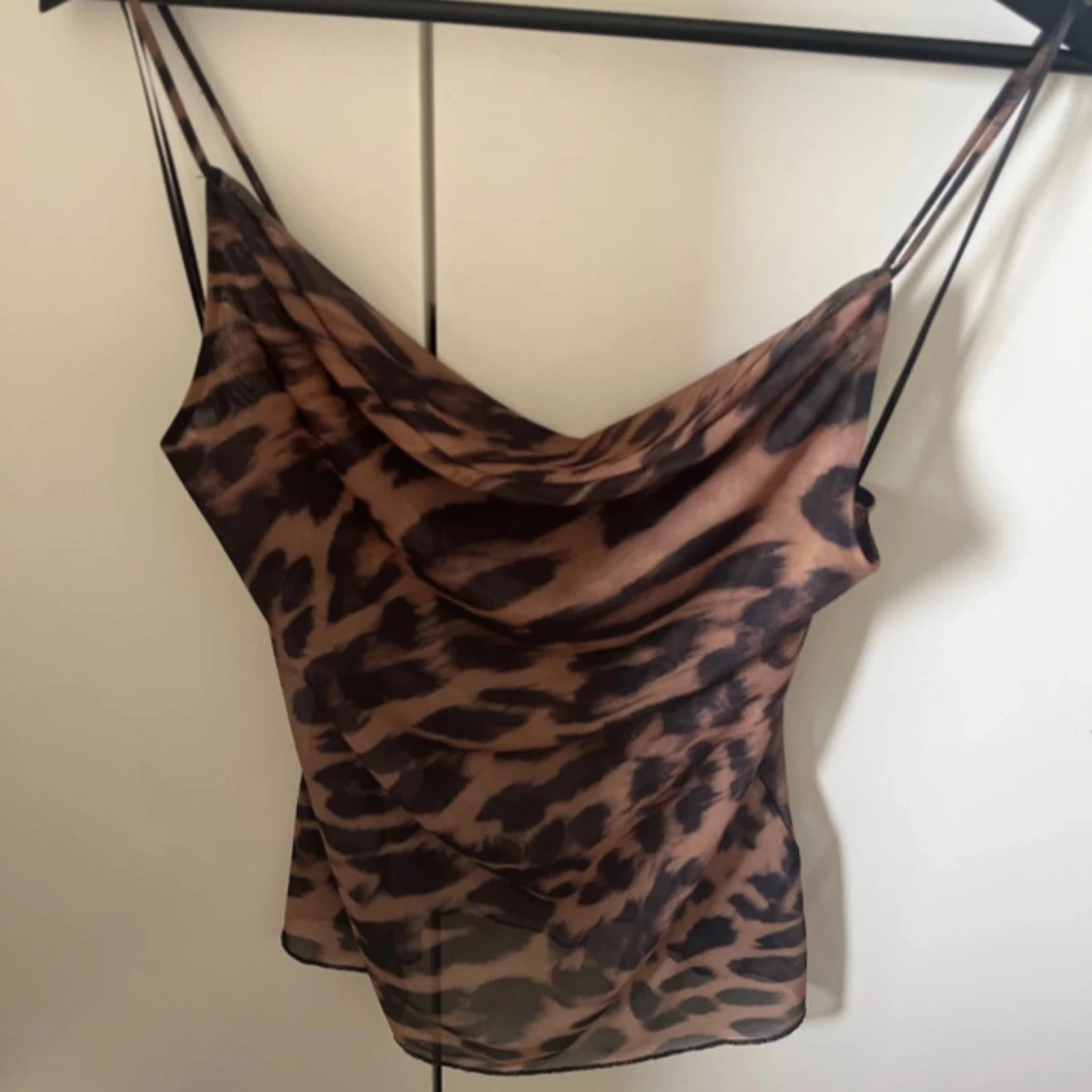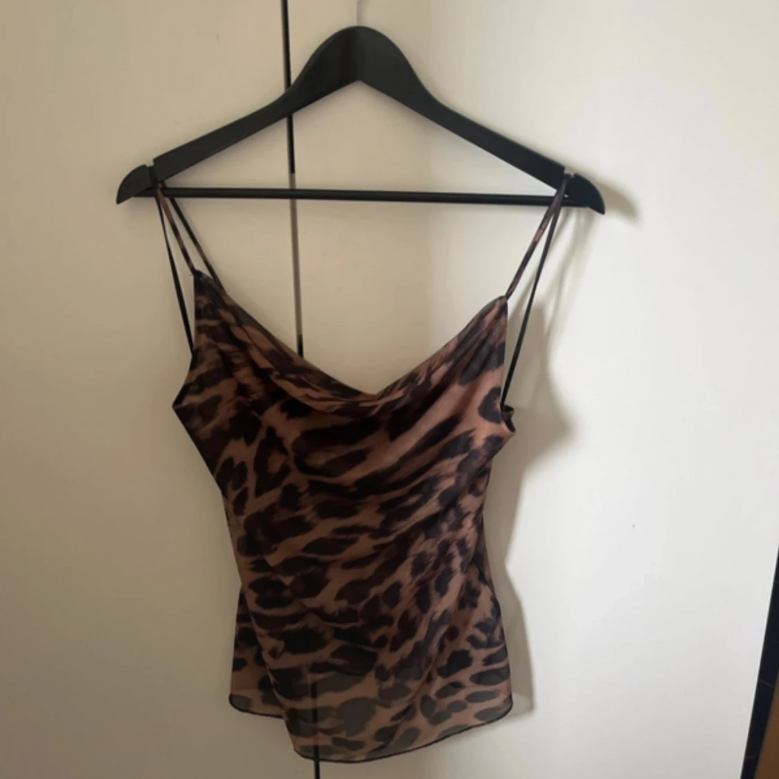 Säljer en snygg leopardmönstrad linnetopp med draperad urringning. Toppen är i bruna och svarta toner och har en lätt, luftig känsla. Perfekt för dig som vill sticka ut med ett djurmönster och gillar trendiga detaljer.