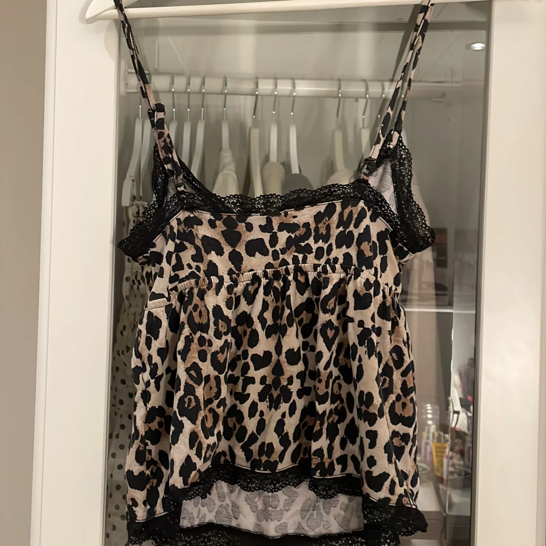 Intresserad? Skriv och köp varan hos Alicen! Supersöt linnetopp från Gina Tricot i leopardmönster med svarta spetsdetaljer längs kanterna. Tunt tyg med smala axelband och lätt volang nedtill. Perfekt för dig som vill sticka ut med en trendig och djärv look.