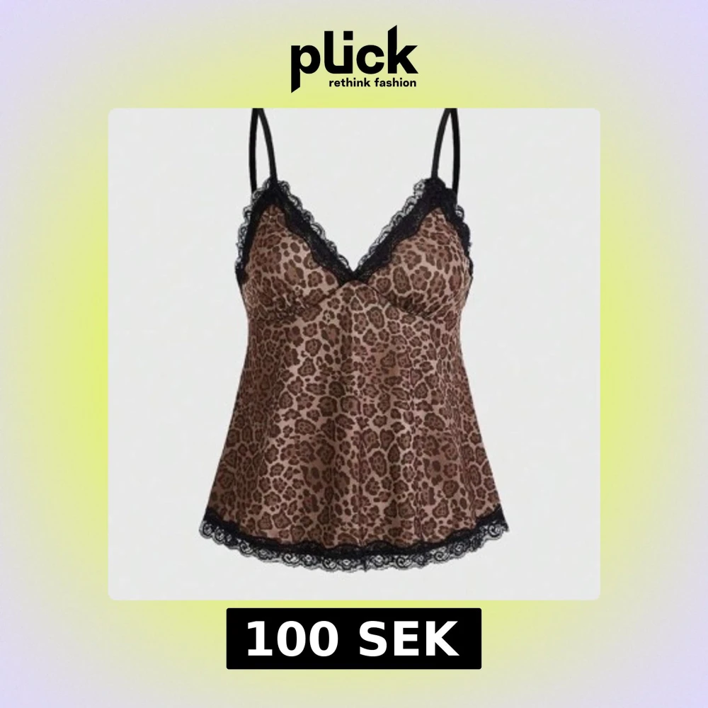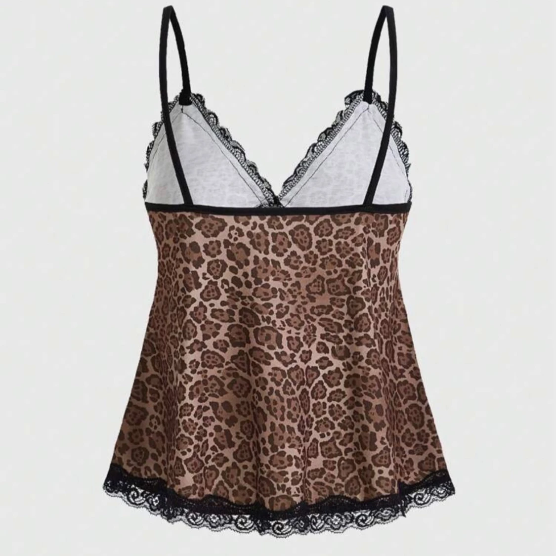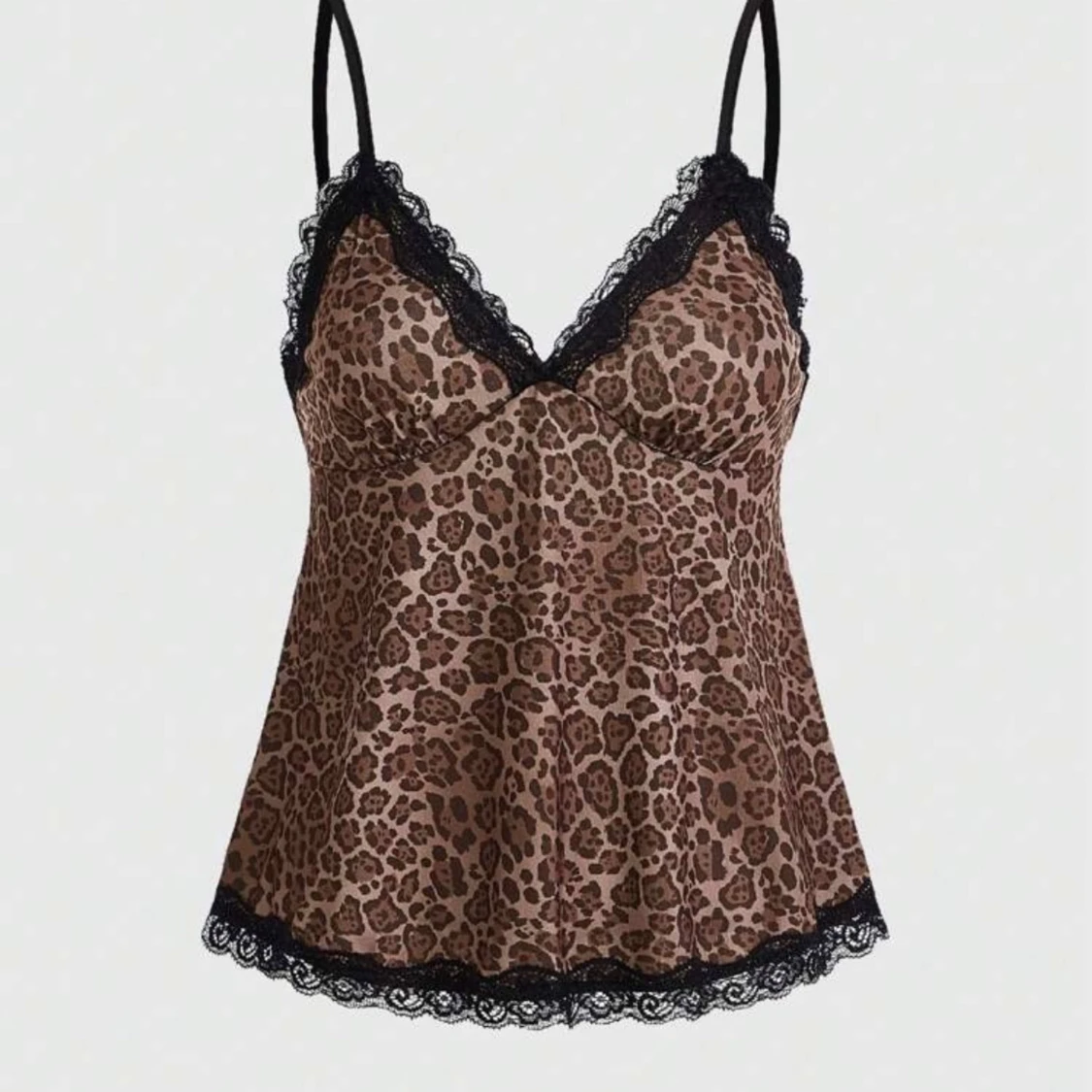 Snygg leopardmönstrad linnetopp med tunna axelband och svarta spetsdetaljer längs urringning och nederkant💗