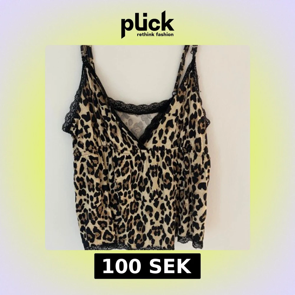 Snygg linnetopp med leopardmönster i beige och svart, med svarta spetsdetaljer längs kanterna. Smala justerbara axelband och v-ringning.
