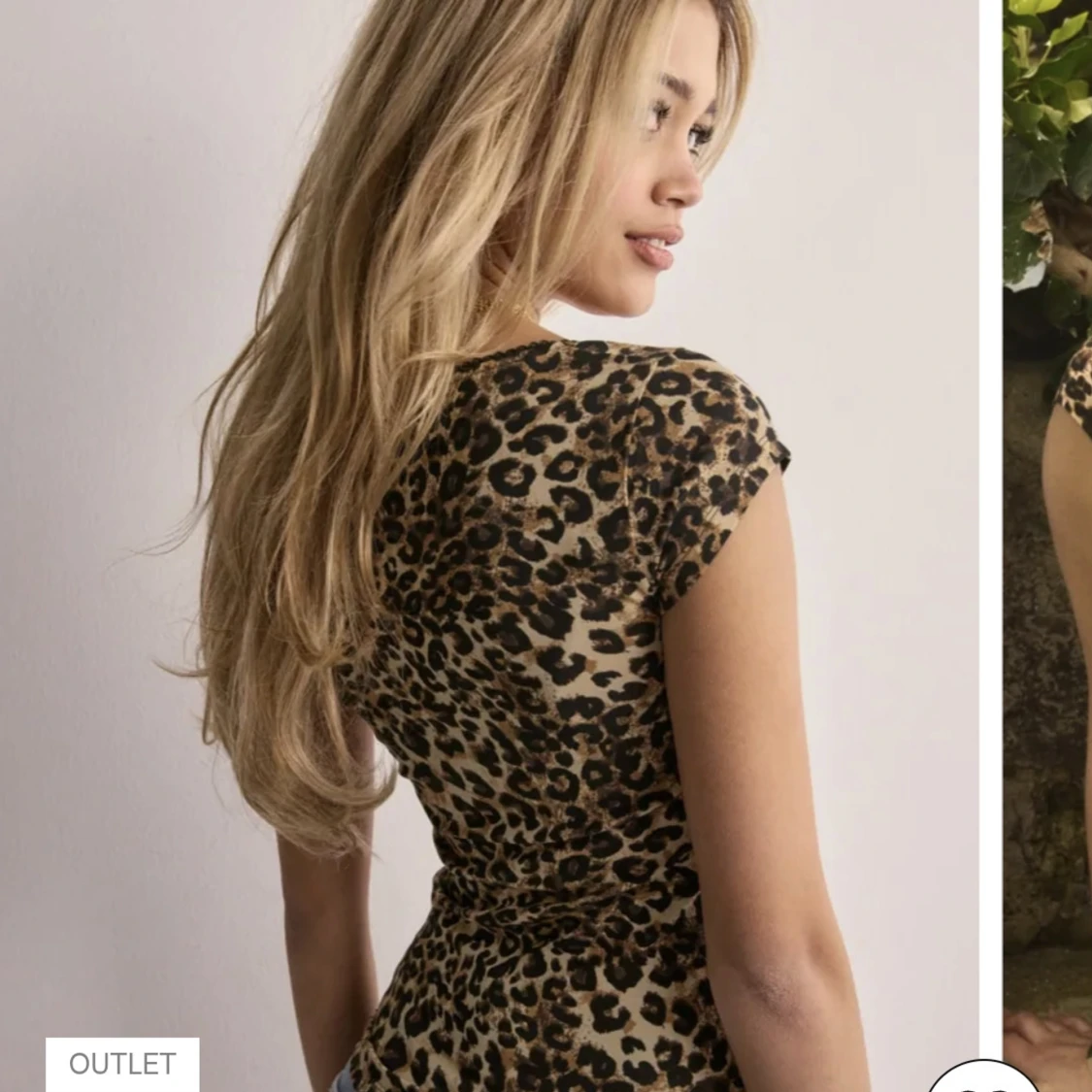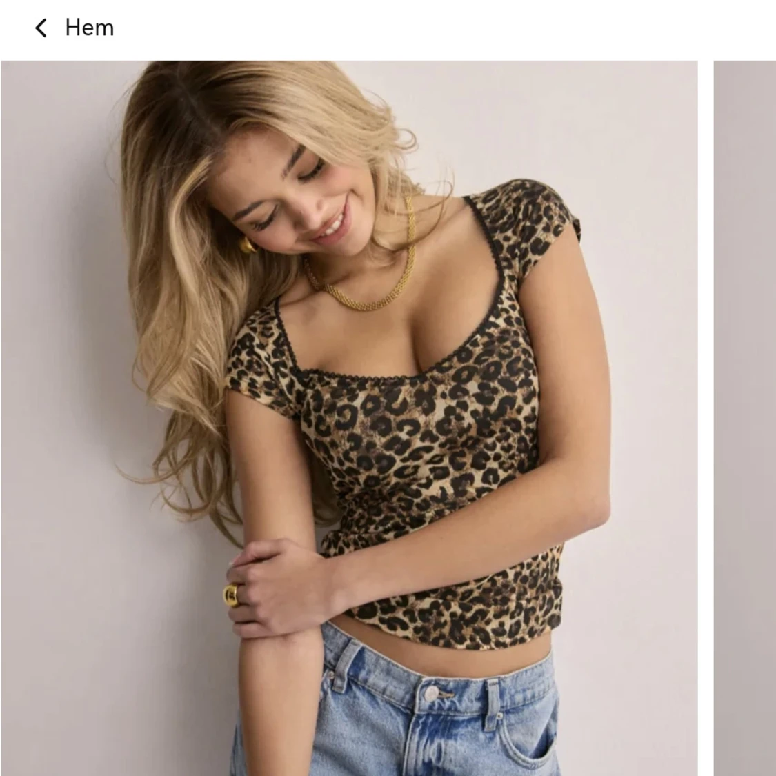 Snygg croppad topp med leopardmönster i bruna och svarta toner. Toppen har korta ärmar, rundad urringning med svart spetskant och figurnära passform. Helt oanvänd