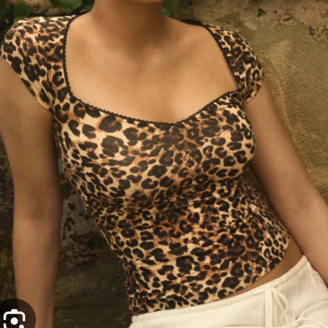 Säljer en topp med leopardmönster. Toppen har korta ärmar, urringad hals med svart spetskant och är figurnära i passformen.