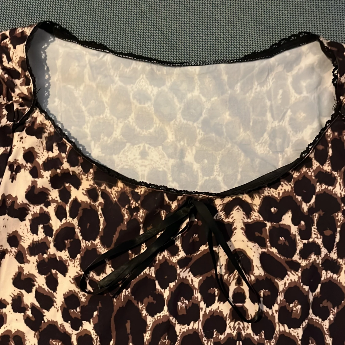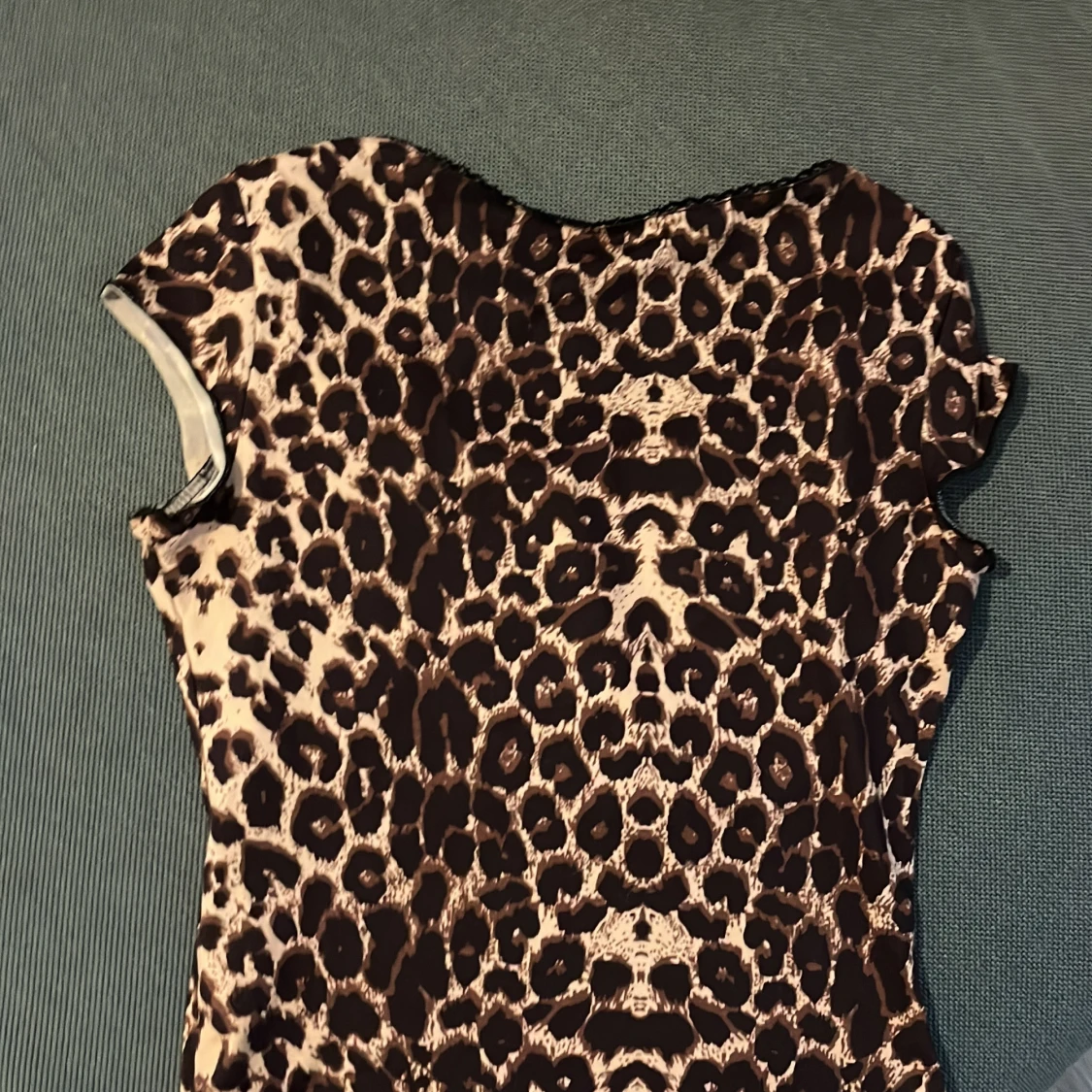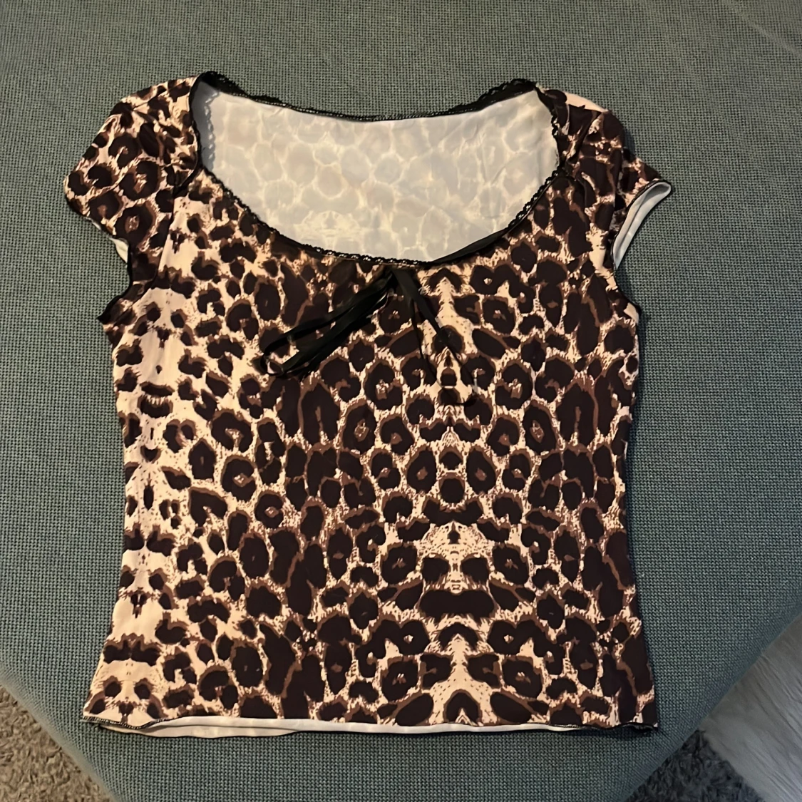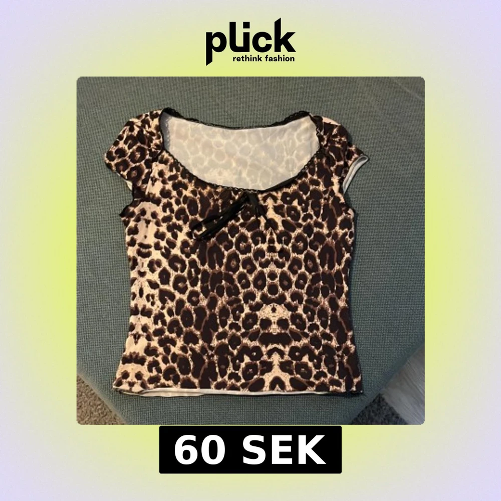 Snygg leopardmönstrad topp med korta ärmar och en söt rosett framtill. Perfekt för att ge din outfit en vild touch. Toppen har en rund halsringning och är tillverkad i ett mjukt material.