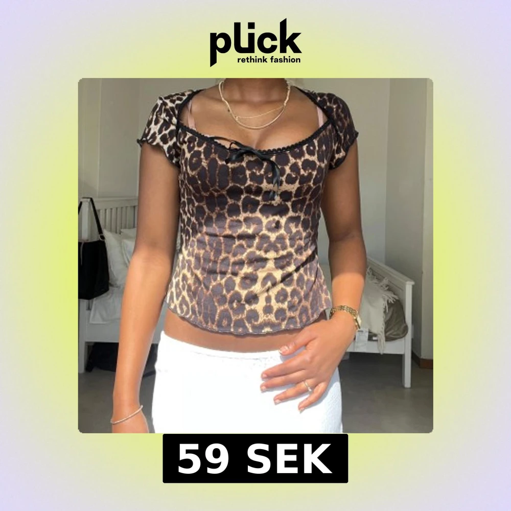 Säljer en leopardmönstrad topp från H&M med korta ärmar och söt svart rosett vid urringningen. Toppen är figurnära och har en lätt croppad passform. Materialet är stretchigt och bekvämt, perfekt för dig som vill sticka ut med ett djurmönster.