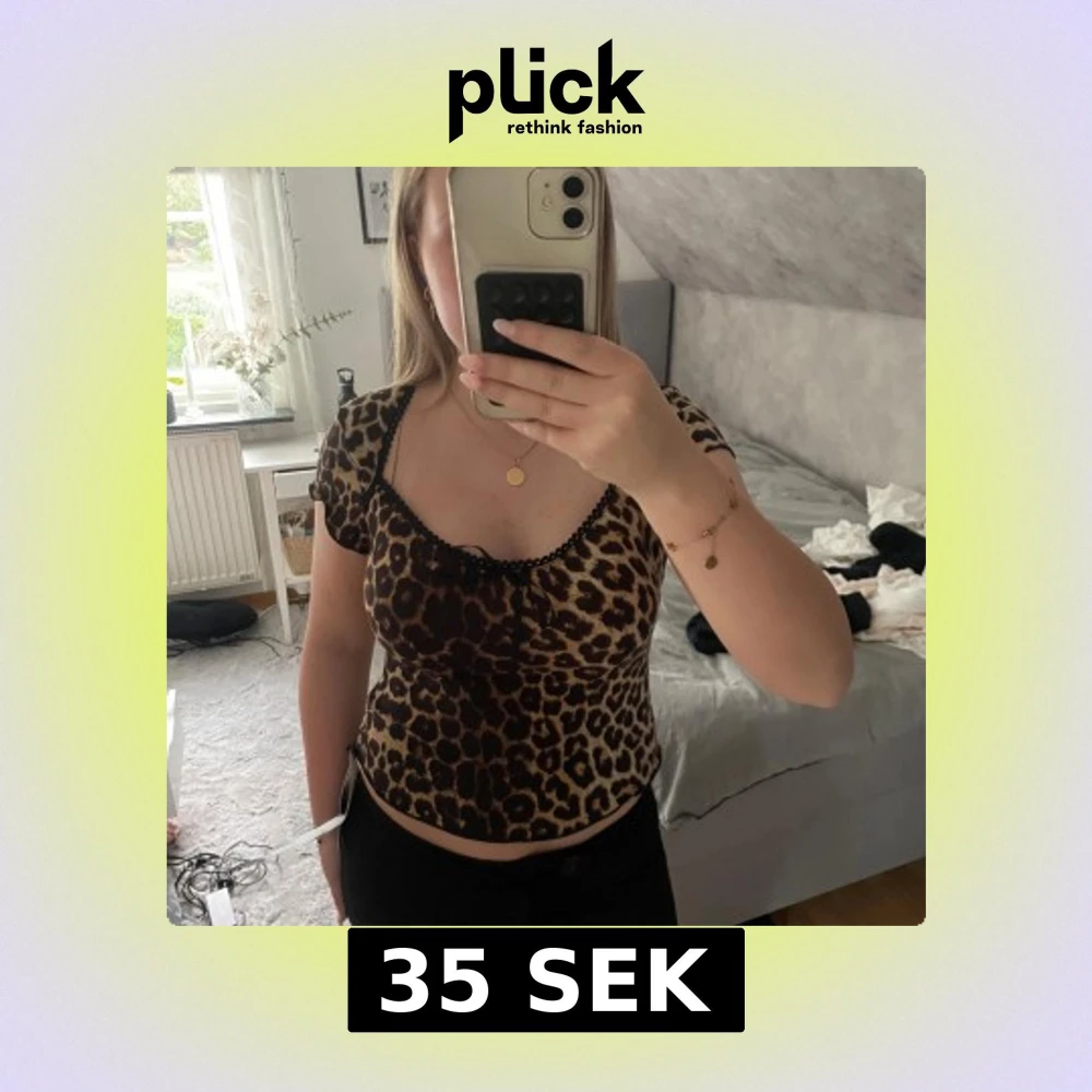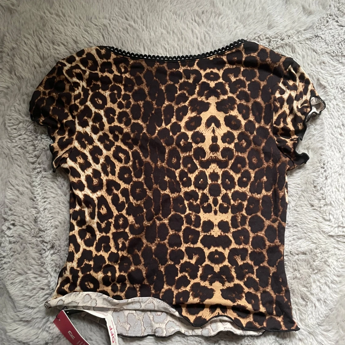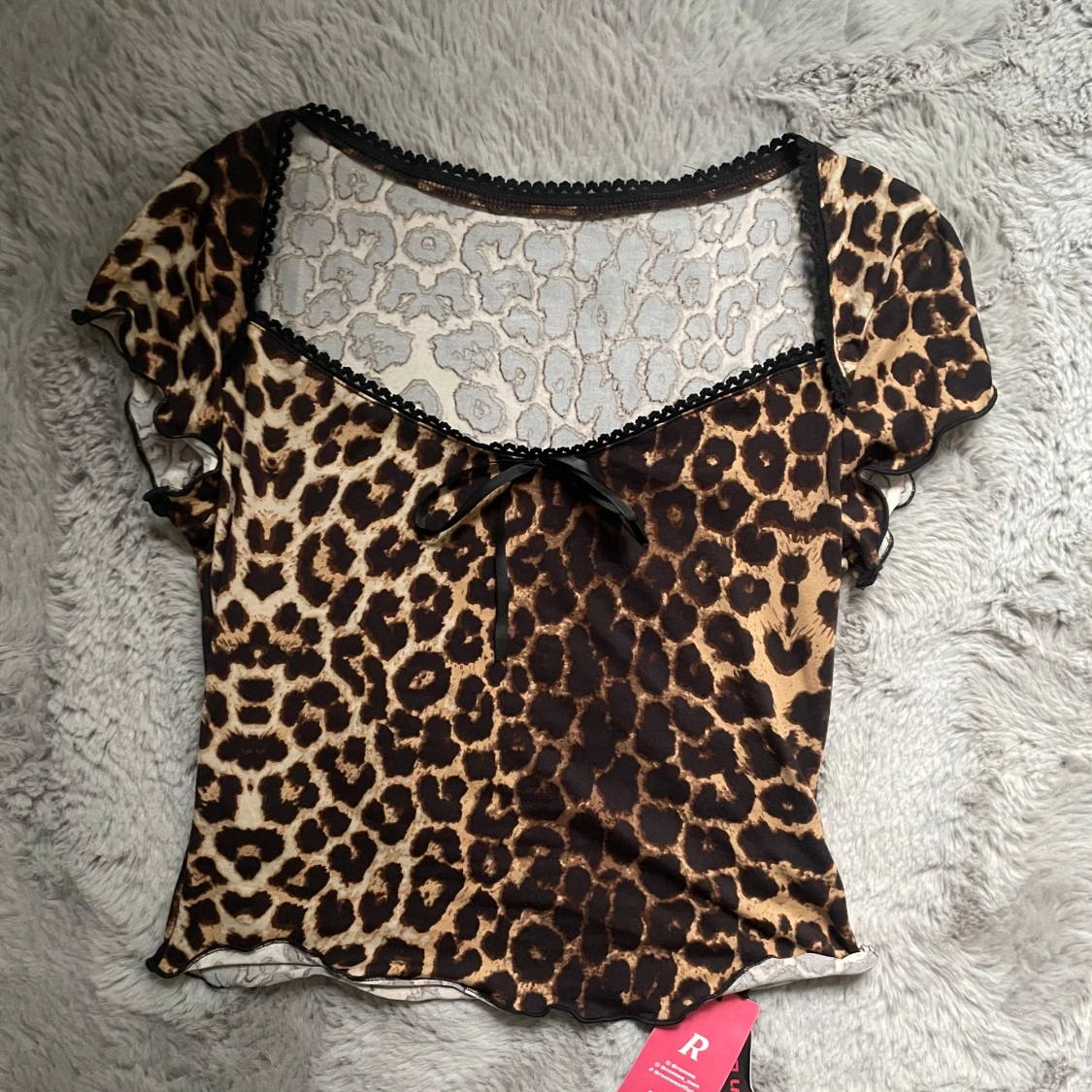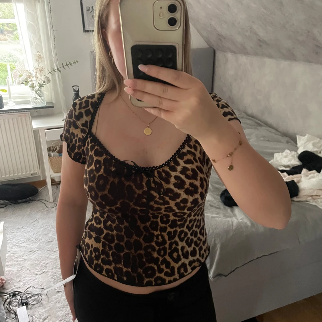 Säljer en topp med leopardmönster i brunt och beige. Toppen har korta ärmar, liten rosett framtill och svarta spetsdetaljer längs urringningen. Materialet är stretchigt och lätt, perfekt för en trendig look.