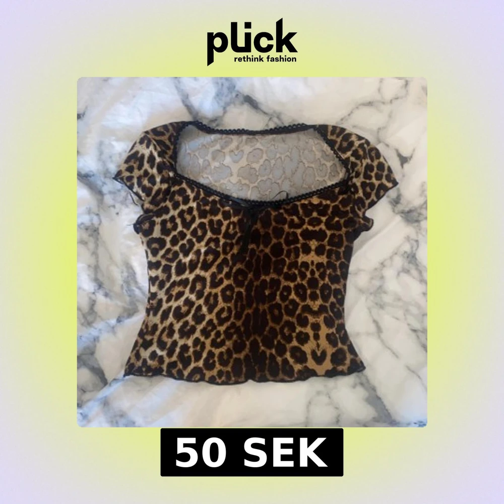 Snygg leopardmönstrad topp med korta ärmar och spetsdetaljer vid halsringningen. Toppen har en liten knytrosett framtill och är perfekt för en trendig look.