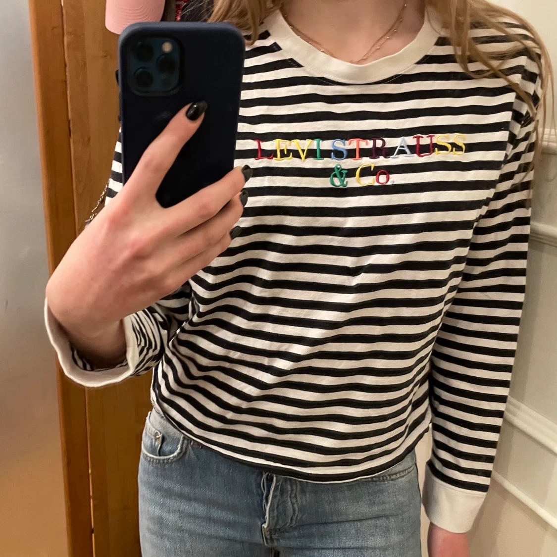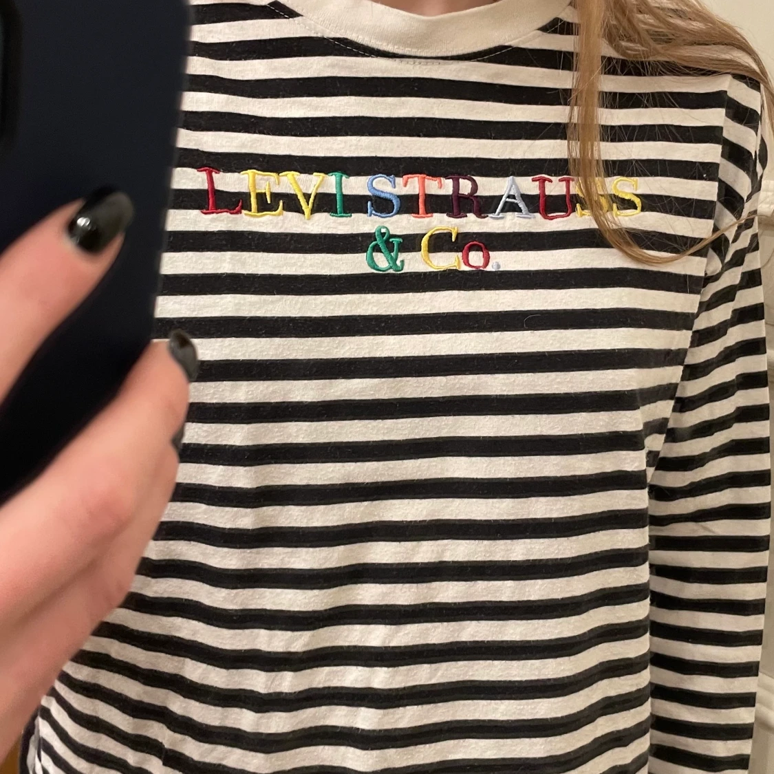 Levis svartvit randig tröja med loggan i regnbåges färg i storlek XS🌈