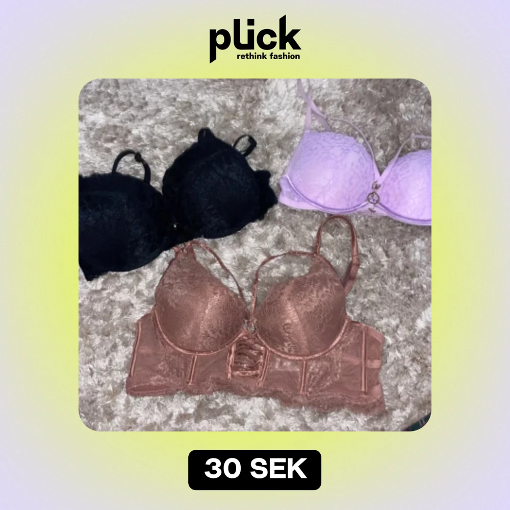 Säljer tre snygga spetsbehåar i olika färger. En svart, en lila och en brun. Den svarta och lila har super push. Den bruna och den lila har en snygg snörning framtill och den svarta är i str 75B och lila och bruna i str 75A. Perfekta för både vardag och fest!🎉