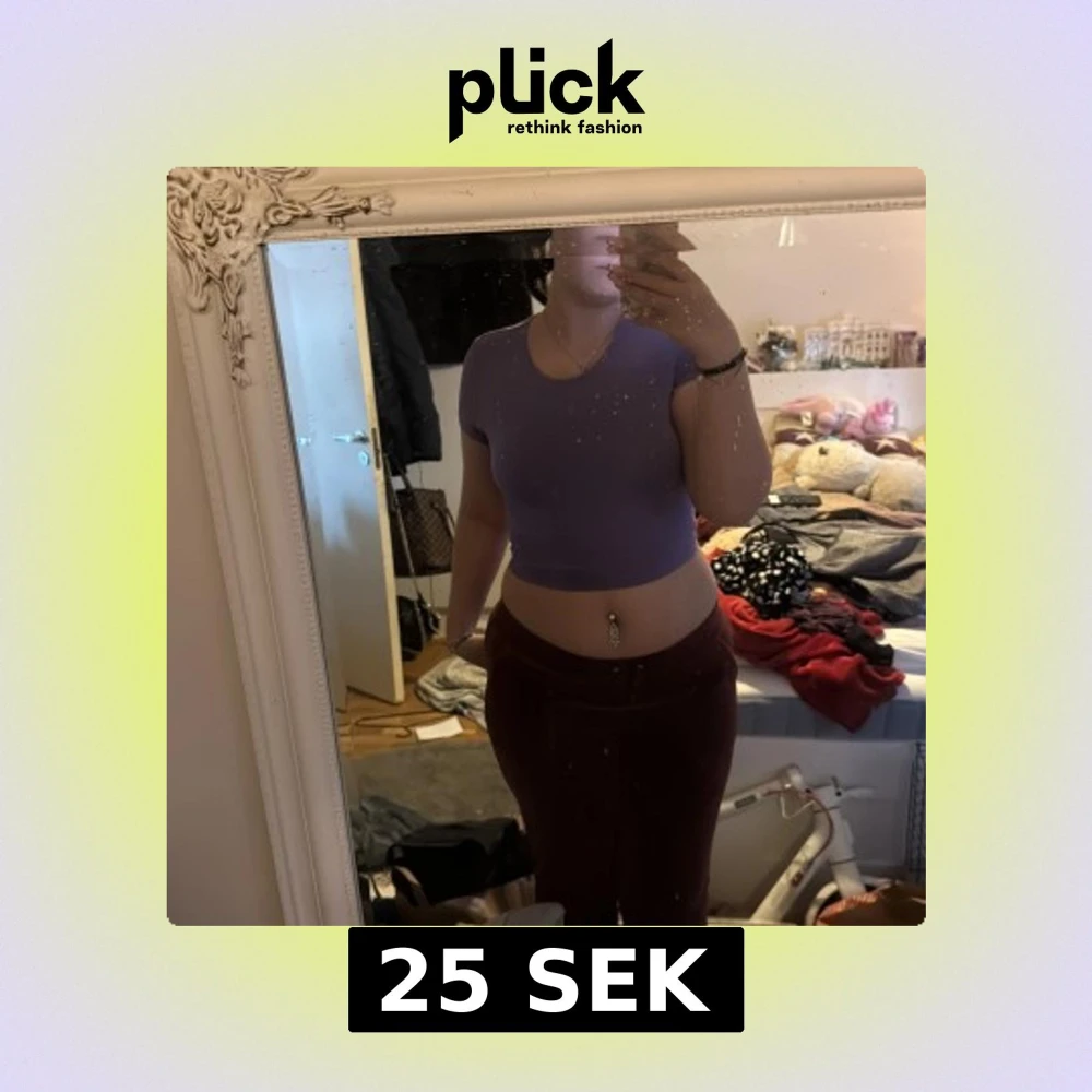 Säljer en lila croppad topp från SHEIN i omlottmodell med knyt i ryggen. T-shirtrund hals och korta ärmar. Perfekt för dig som gillar trendiga och färgglada plagg!