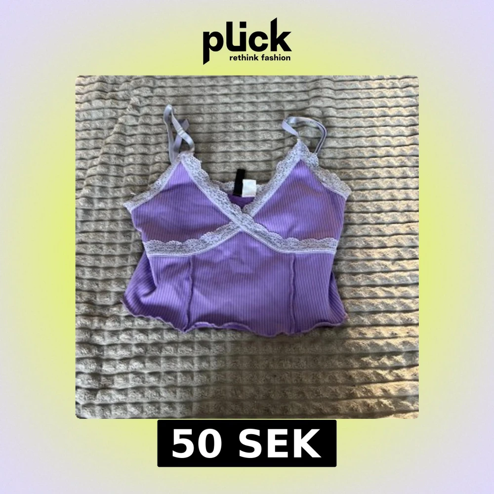 Säljer en söt lila ribbad linnetopp med vita spetsdetaljer. Toppen har smala axelband och en omlott-design framtill. Perfekt för varma dagar eller som ett lager under en tröja.