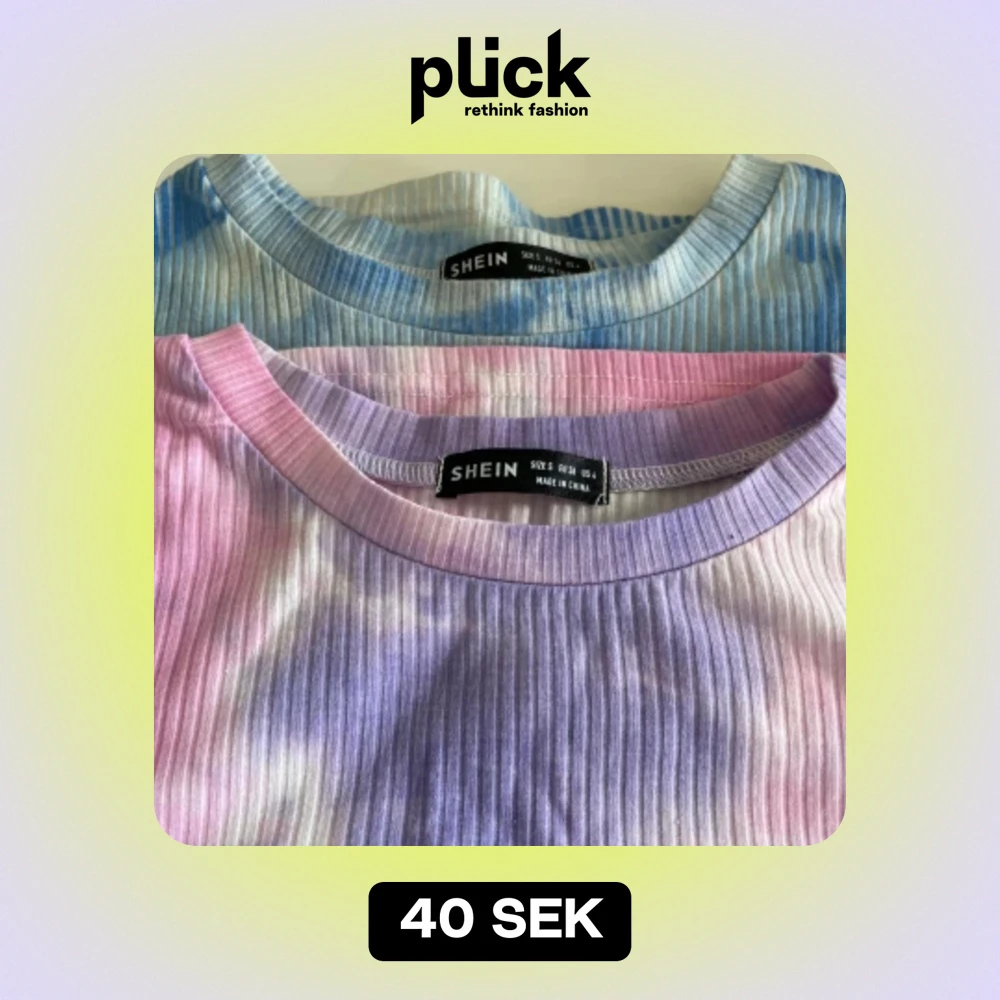 Två ribbade t-shirts från Shein i storlek S. Den ena är blå och vit, medan den andra är lila och rosa. Båda t-shirts har korta ärmar och är tillverkade i ett bekvämt material.