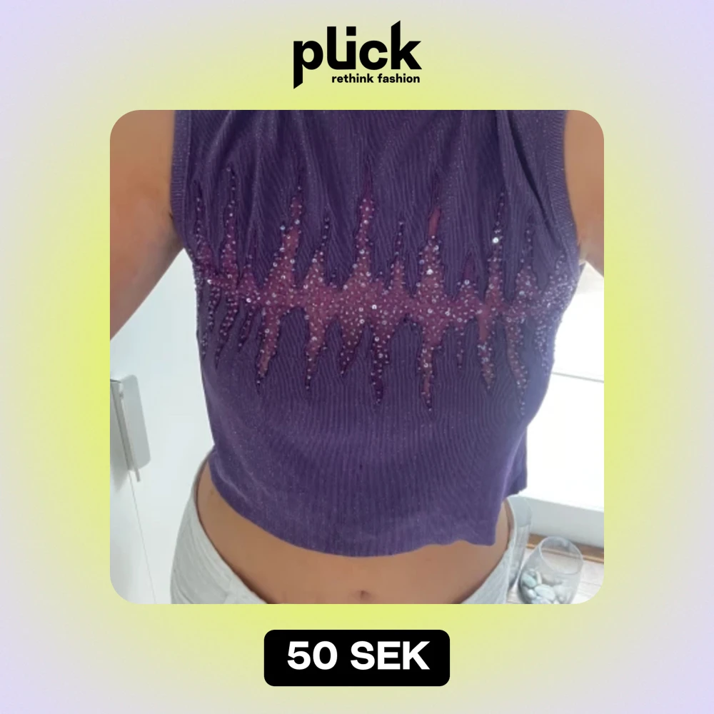 Lila topp med mesh detaljer över bysten. Med pärlor som fint broderats på. Polo/ högre krage med en dragkedja där bak. Tyget är glittrigt. Finns ingen lapp men passar mig bra som är en stl S, den har lite stretch i sig så kan passa större storlekar