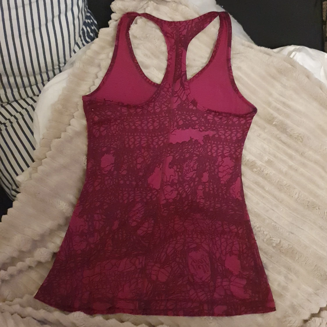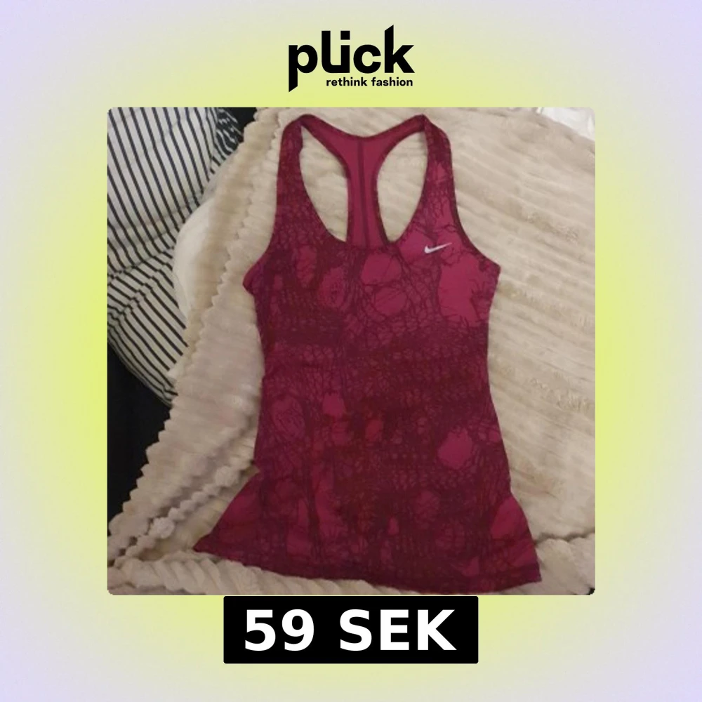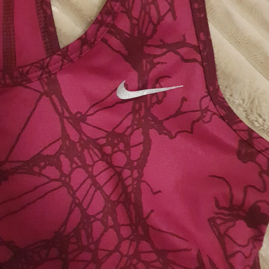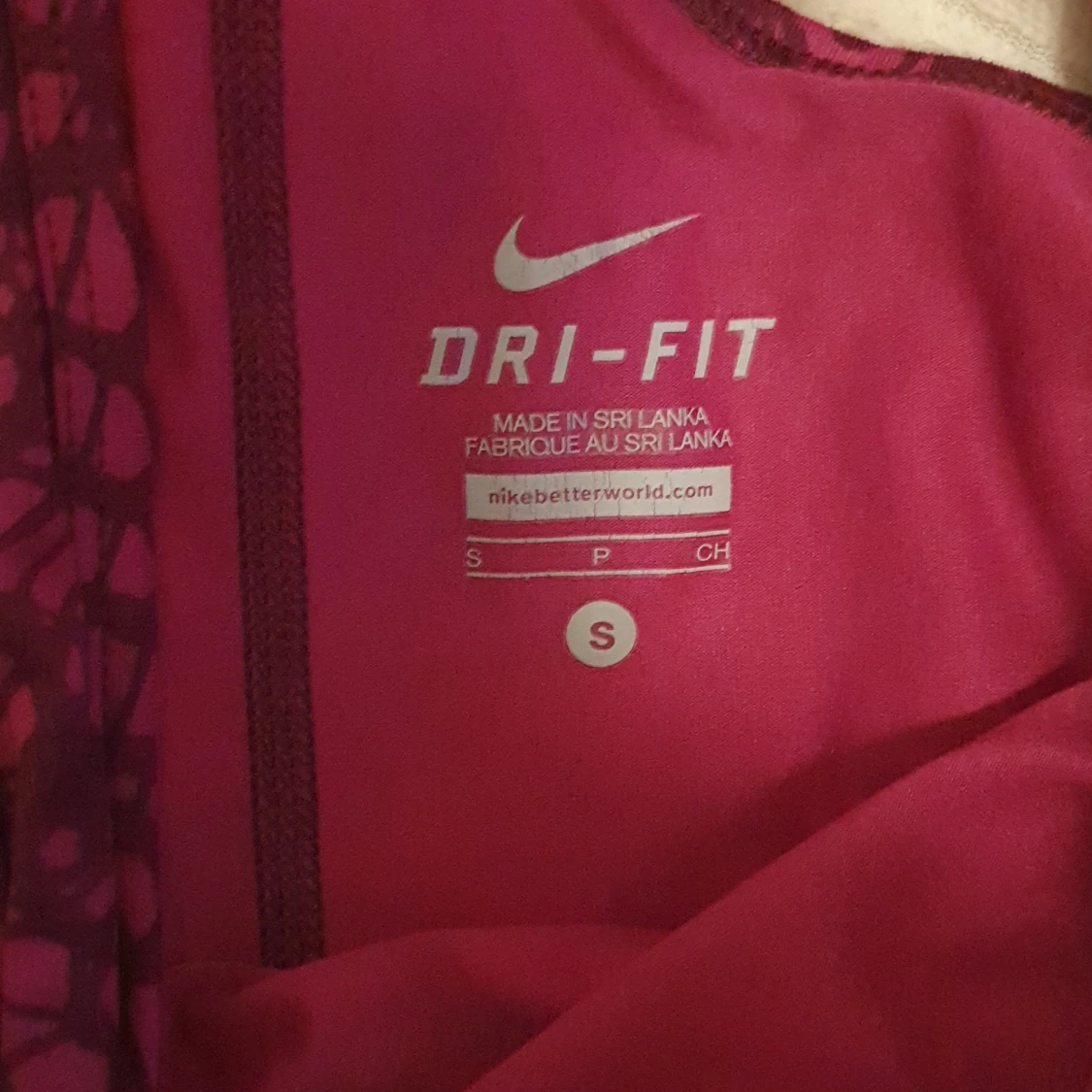 Säljer en lila-vinröd Nike Dri-Fit linnetopp i storlek S. Toppen har ett unikt abstrakt mönster i mörkare röd nyans och klassisk racerback-modell. Perfekt för träning med sitt svala och snabbtorkande material. Liten vit Nike-logga framtill.