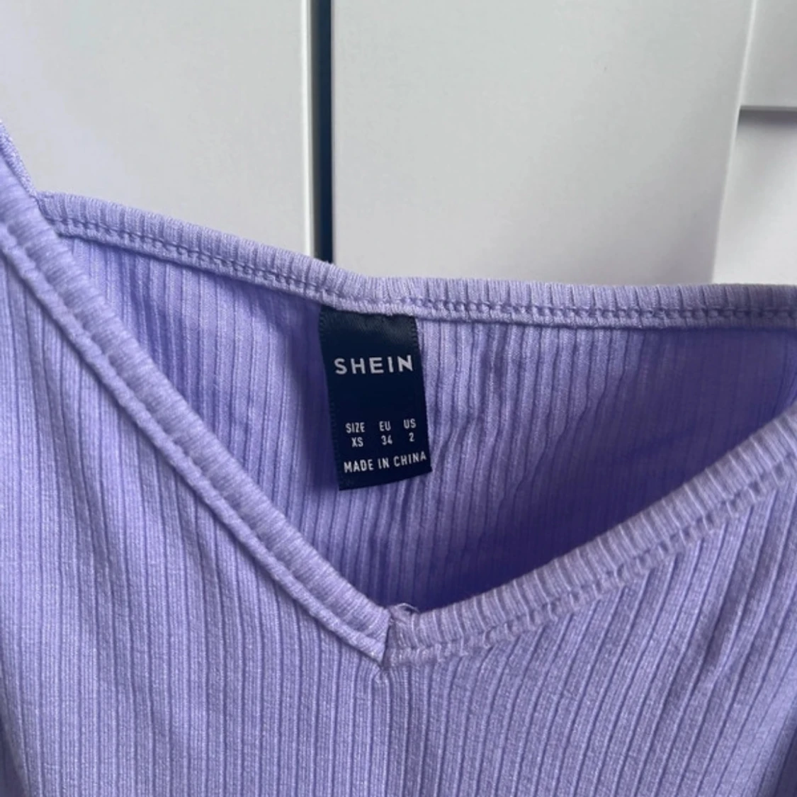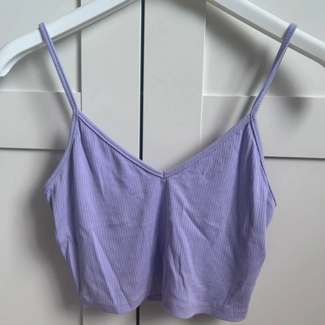 Säljer en söt ljuslila ribbad linnetopp från Shein. Toppen har smala axelband och en v-ringad design. Perfekt för varma dagar eller som ett lager under en tröja.