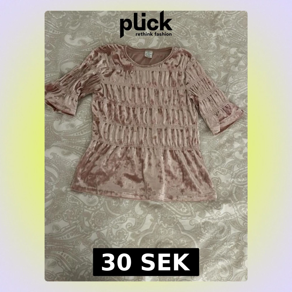 Supersöt rosa sammetsblus från Lindex med rynkade detaljer och halvlånga trumpetärmar. Blusen har en mjuk glansig yta och rund halsringning. Perfekt för dig som vill ha en unik och trendig topp med lite extra volym i ärmarna.