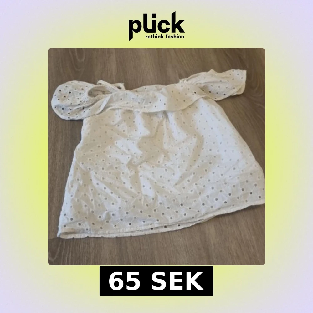 Söt vit offshoulder topp från Lindex med broderade hål och volangkant. Toppen har smala axelband och korta ärmar som sitter nedanför axlarna. Perfekt för varma dagar och ger en fräsch och somrig look.