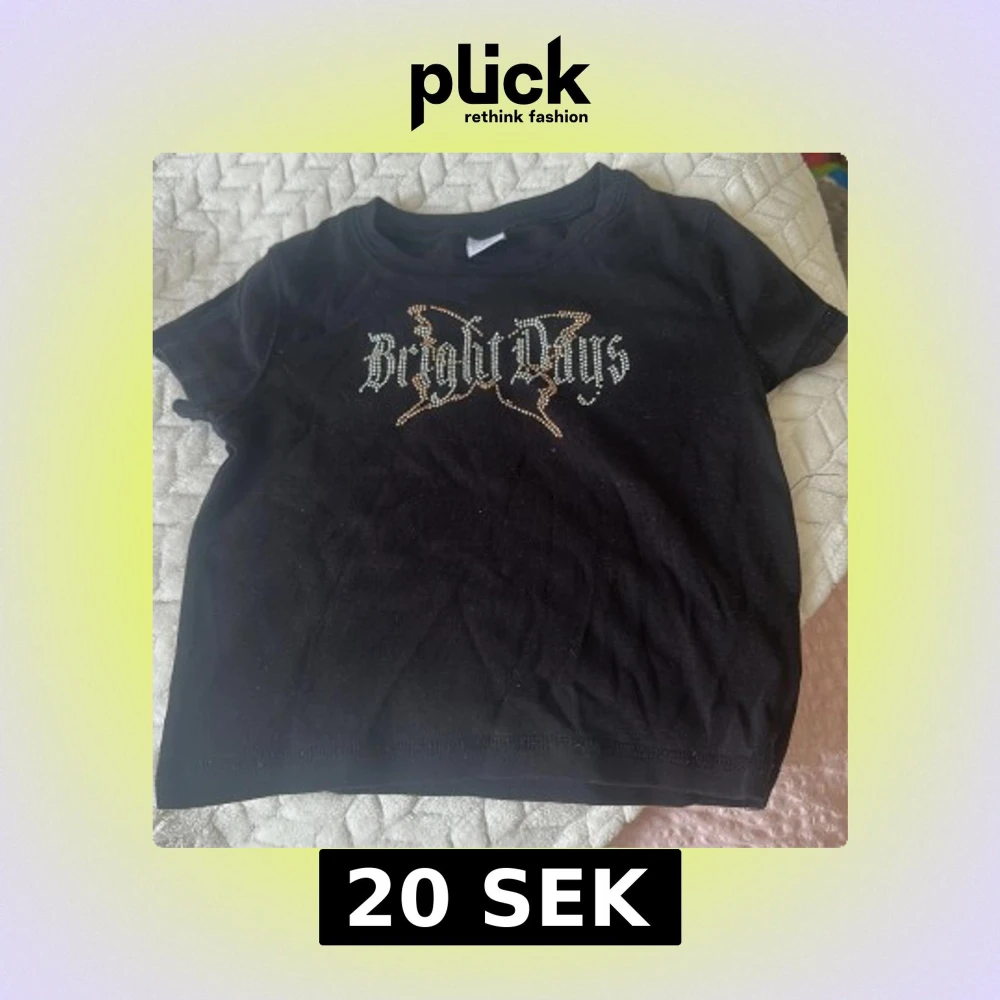 Cool svart topp från Lindex med korta ärmar och rund hals. Framsidan har ett snyggt strassmotiv med texten 'Bright Days' och en fjäril i silver och guld. Materialet är mjuk bomull som känns skönt mot huden. Perfekt för dig som gillar lite extra bling i vardagen.