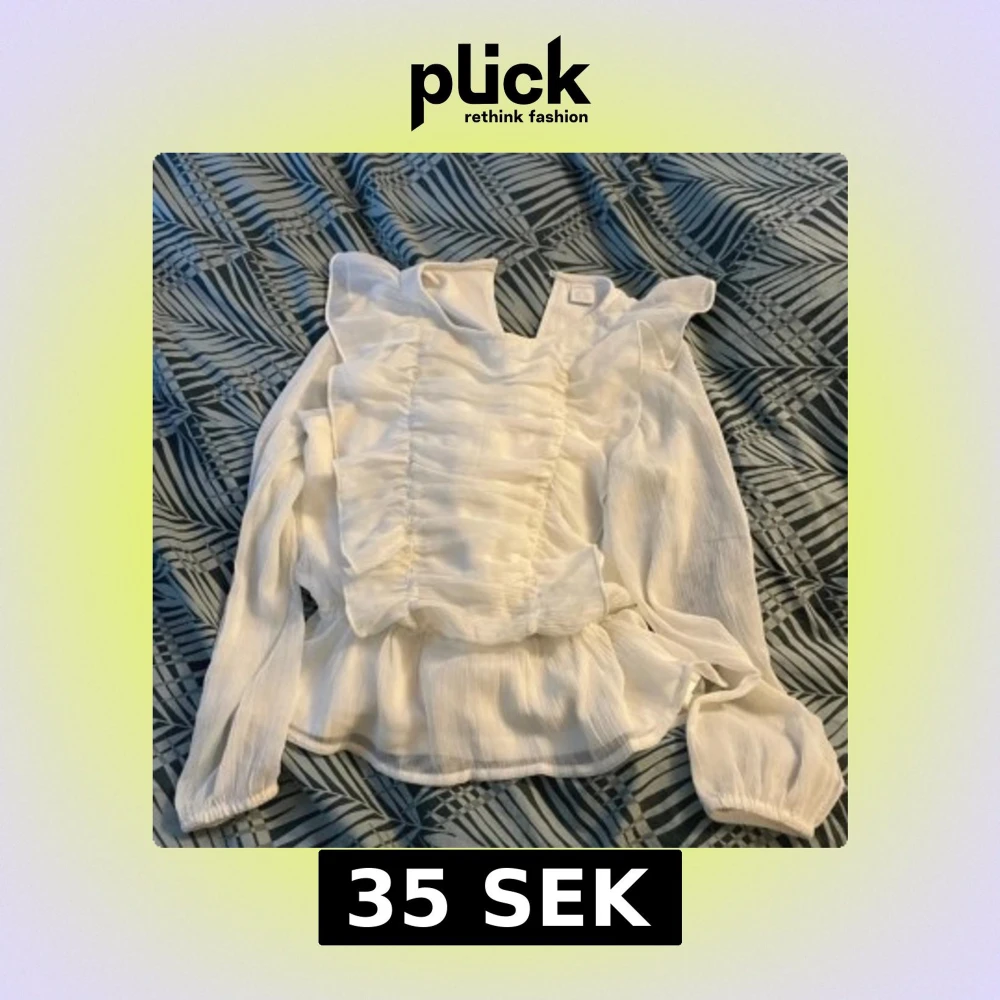 Supersöt vit blus med volangdetaljer och rynk framtill. Långa ärmar med lätt puff och elastiska muddar. Tunt, luftigt tyg som ger en flowy känsla. Perfekt för dig som gillar romantisk och feminin stil.