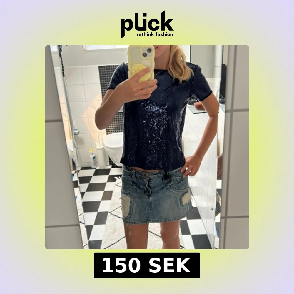 Säljer en mörkblå topp från Lindex med massor av glittrande paljetter. T-shirten har korta ärmar och rund halsringning. Perfekt för dig som vill sticka ut med en riktigt snygg och glittrig look.