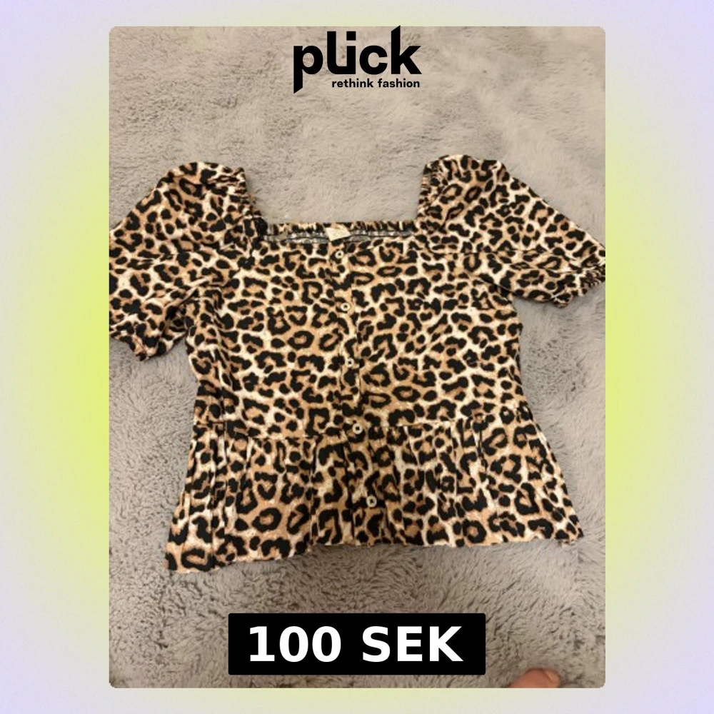Säljer en leopardmönstrad blus med puffiga korta ärmar och knappar framtill.