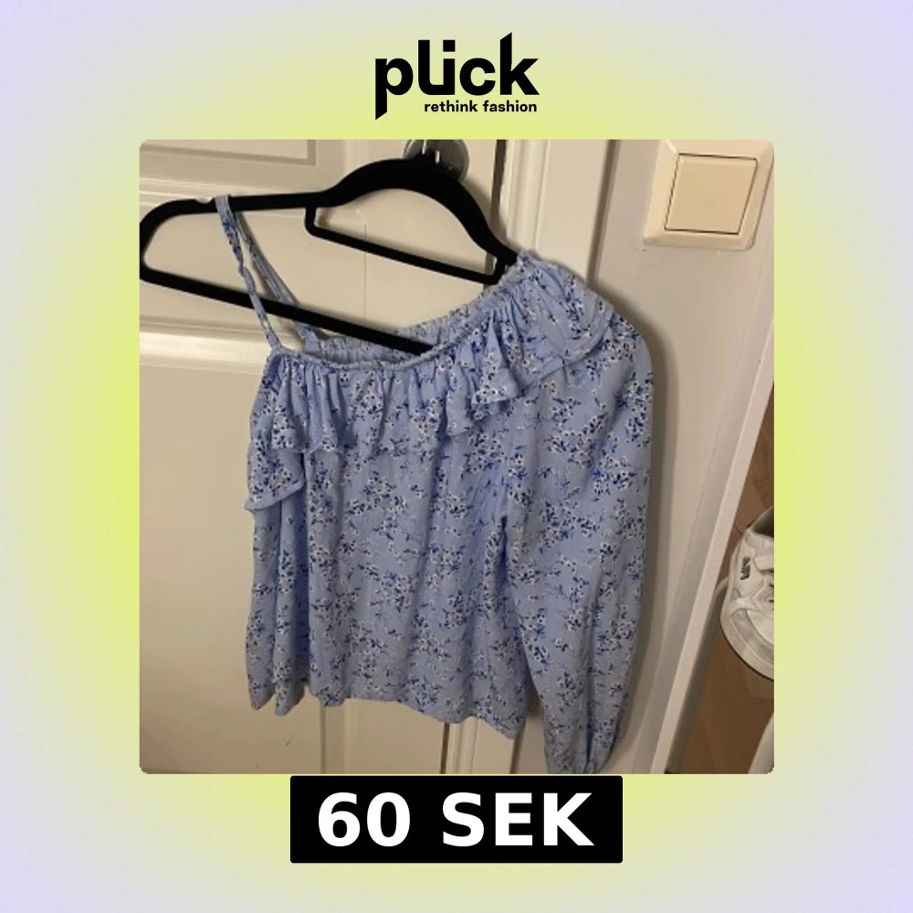 Söt ljusblå offshoulder topp från Lindex med blommigt mönster i vitt och blått. Toppen har en volang längs halsringningen och en axelbandslös sida samt en lång ärm. Perfekt för vår och sommar när du vill ha en luftig och trendig look.