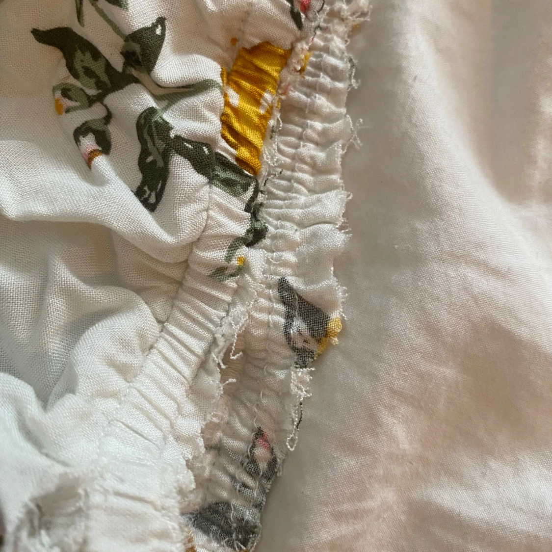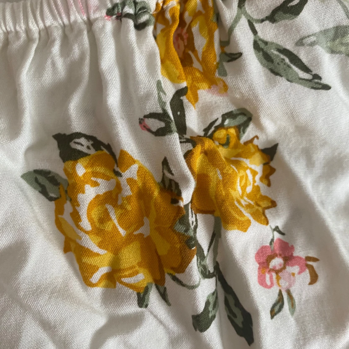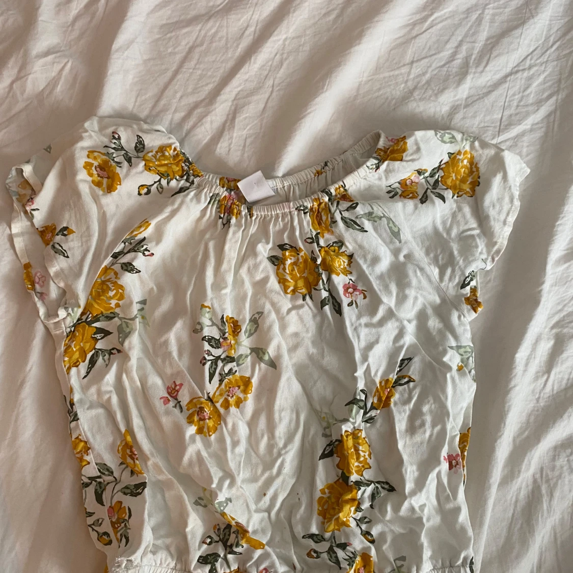 Supersöt vit blus med gula och rosa blommor, elastisk halsringning och midja för en avslappnad och luftig känsla. Korta ärmar med lätt volang och romantiskt blommönster gör den perfekt för vår och sommar. Materialet känns lätt och andas bra. Tröjan är en avklippt byxdress de är därför de vid midjan som man ser på bild 3 men de går att klippa bort utan problem. Pris kan diskuteras