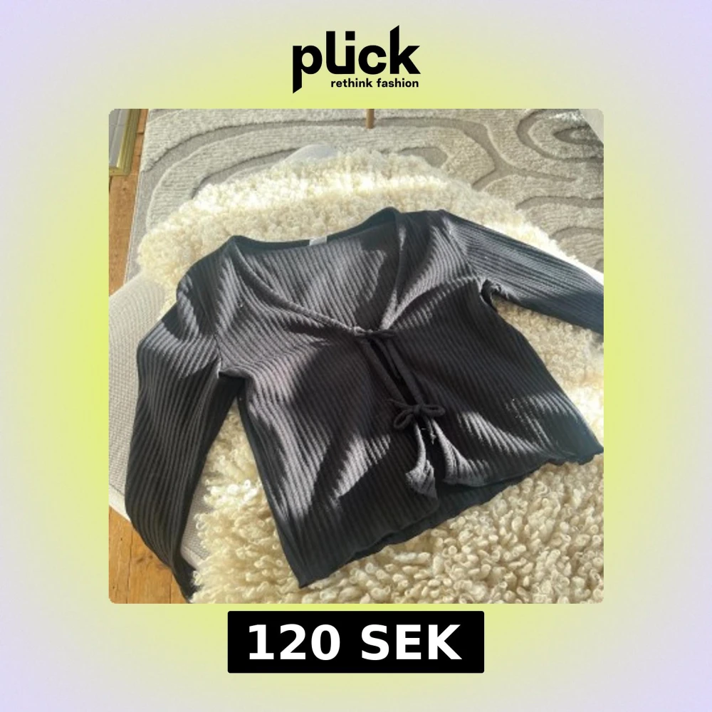 Svart topp från Lindex med knyt framtill och lång ärm. Toppen har en djup v-ringning och är tillverkad i ett mjukt, stretchigt material som sitter snyggt. Lite nopprig men annars i bra skick.