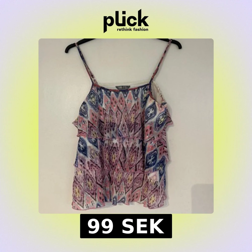 Färgglad linnetopp från Lindex med smala axelband och flera volanglager. Toppen har ett abstrakt mönster i blått, rosa, vitt och gult samt dekorativa pärlor längs halsringningen. Perfekt för varma dagar.