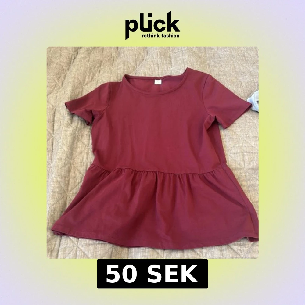 Supersöt vinröd blus med peplumvolang nedtill och rund halsringning. Toppen har korta ärmar och är gjord i mjuk bomull, perfekt för dig som gillar en chill och feminin stil. Volangen ger en extra touch och gör den enkel att styla med jeans eller kjol.