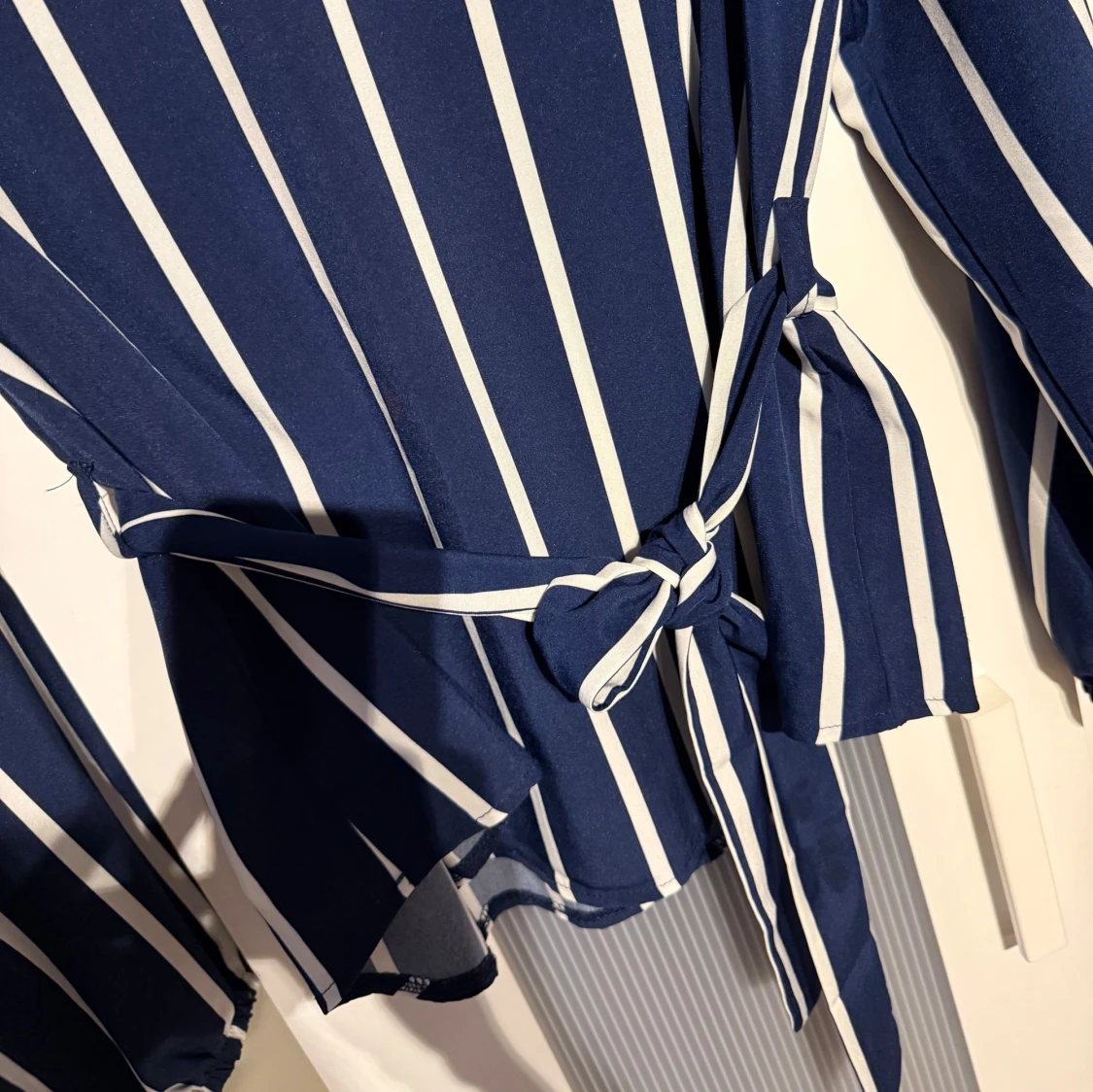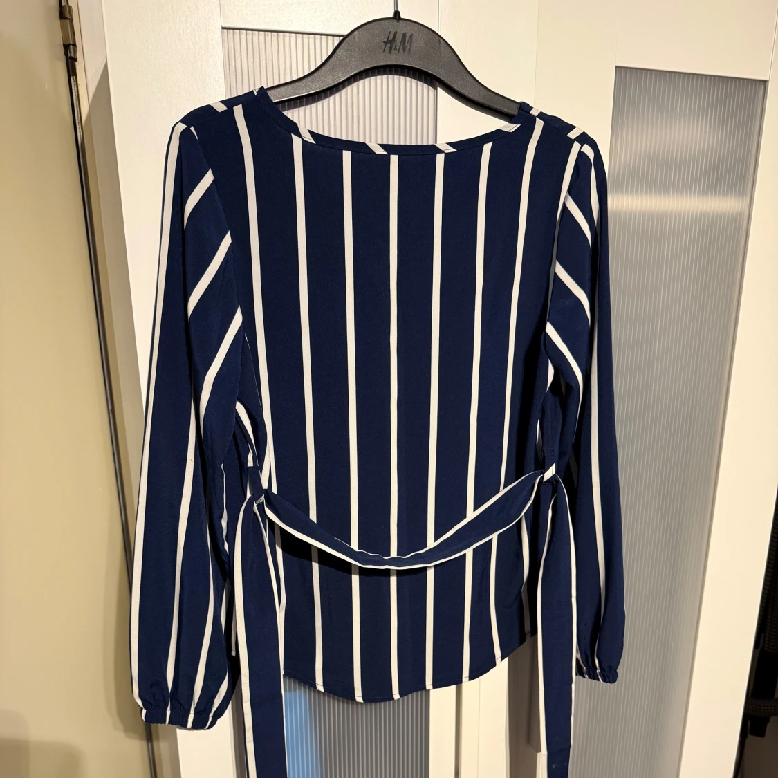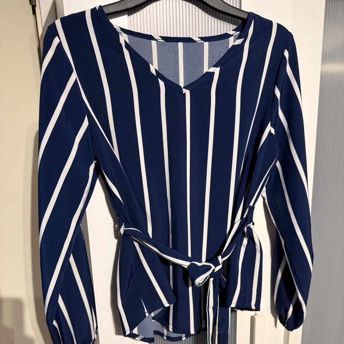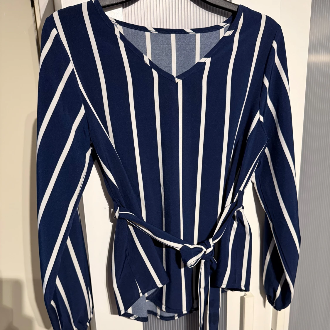 Snygg marinblå blus med vita vertikala ränder och v-ringning. Långa ärmar med resår vid handlederna och ett knytband i midjan som ger en schysst siluett. Perfekt för dig som gillar stilrena och trendiga plagg.