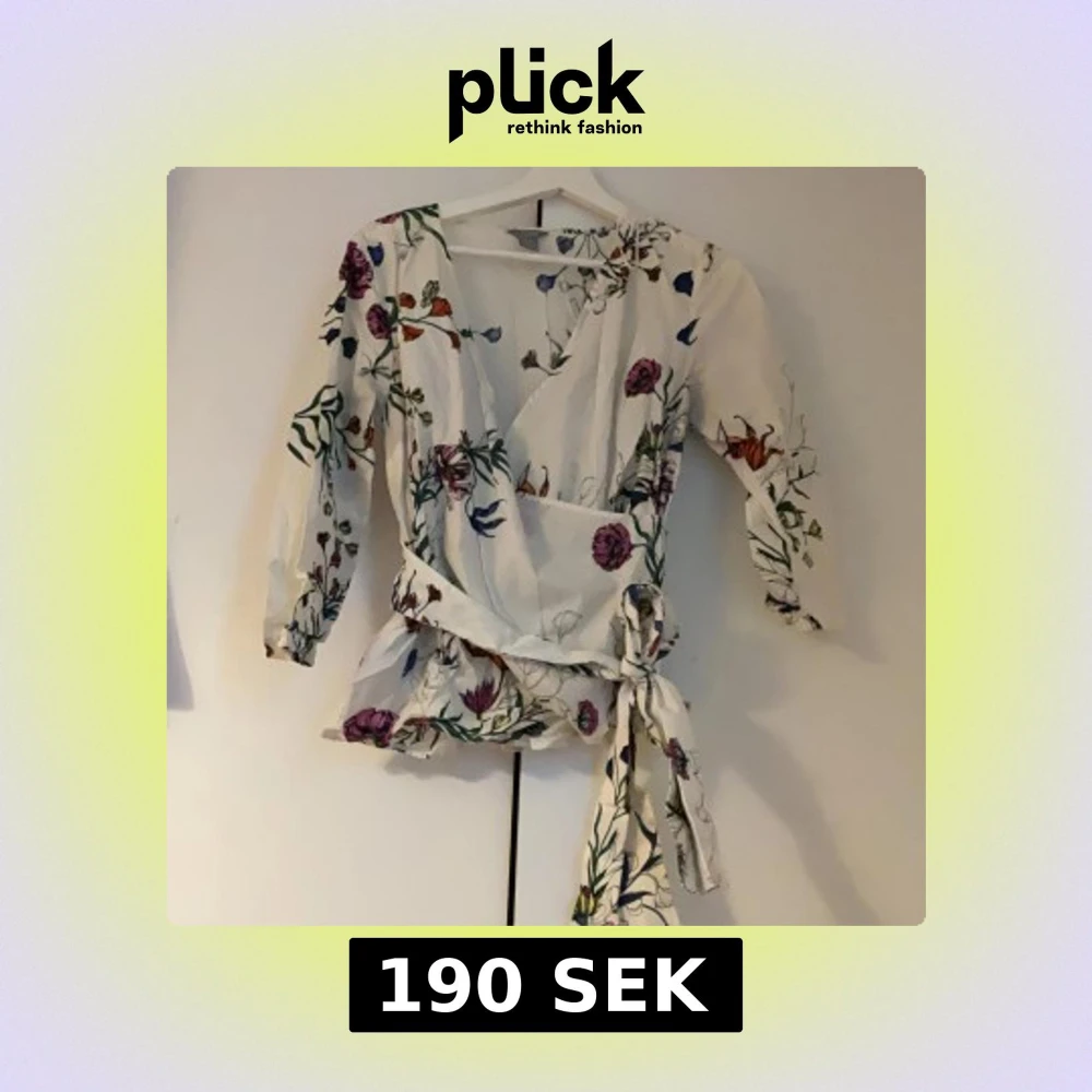 Superfin vit omlottblus med färgglatt blommönster och knytband i midjan. Blusen har trekvartsärmar och volangkant nertill, perfekt för en fräsch och somrig look. Snygg v-ringning och lätt, luftig känsla.