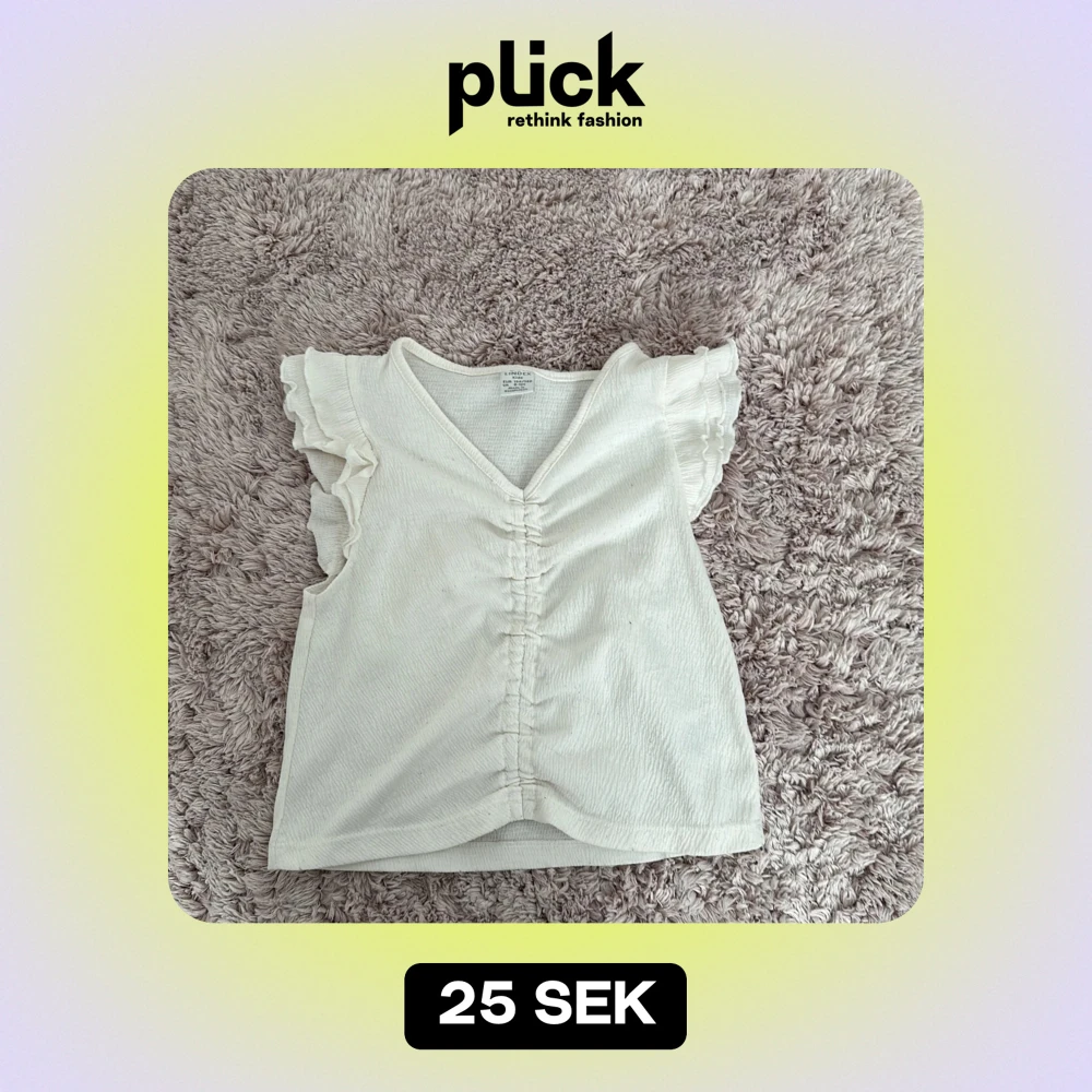 Säljer en söt vit ribbad topp med volangärmar och v-ringning. Perfekt för sommardagar eller en avslappnad vårlook. Toppen har en fin rynkdetalj framtill som ger den lite extra stil. Passar bra till både jeans och kjol!