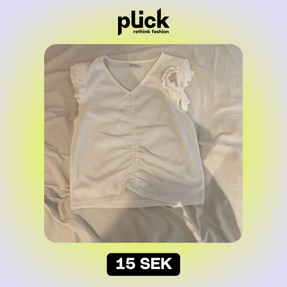 Säljer en söt vit topp från Lindex. Den har en v-ringad hals och ärmlös design med volangdetaljer på axlarna. Toppen har en snygg rynkning framtill. Perfekt för sommaren eller en festlig tillställning! Endast använd 1-2 gånger