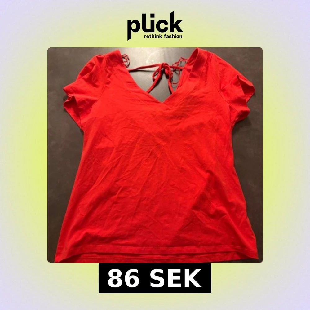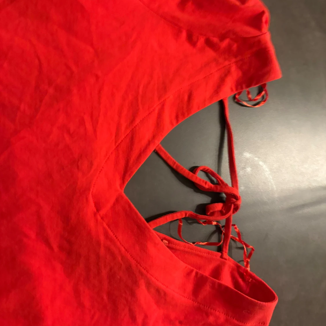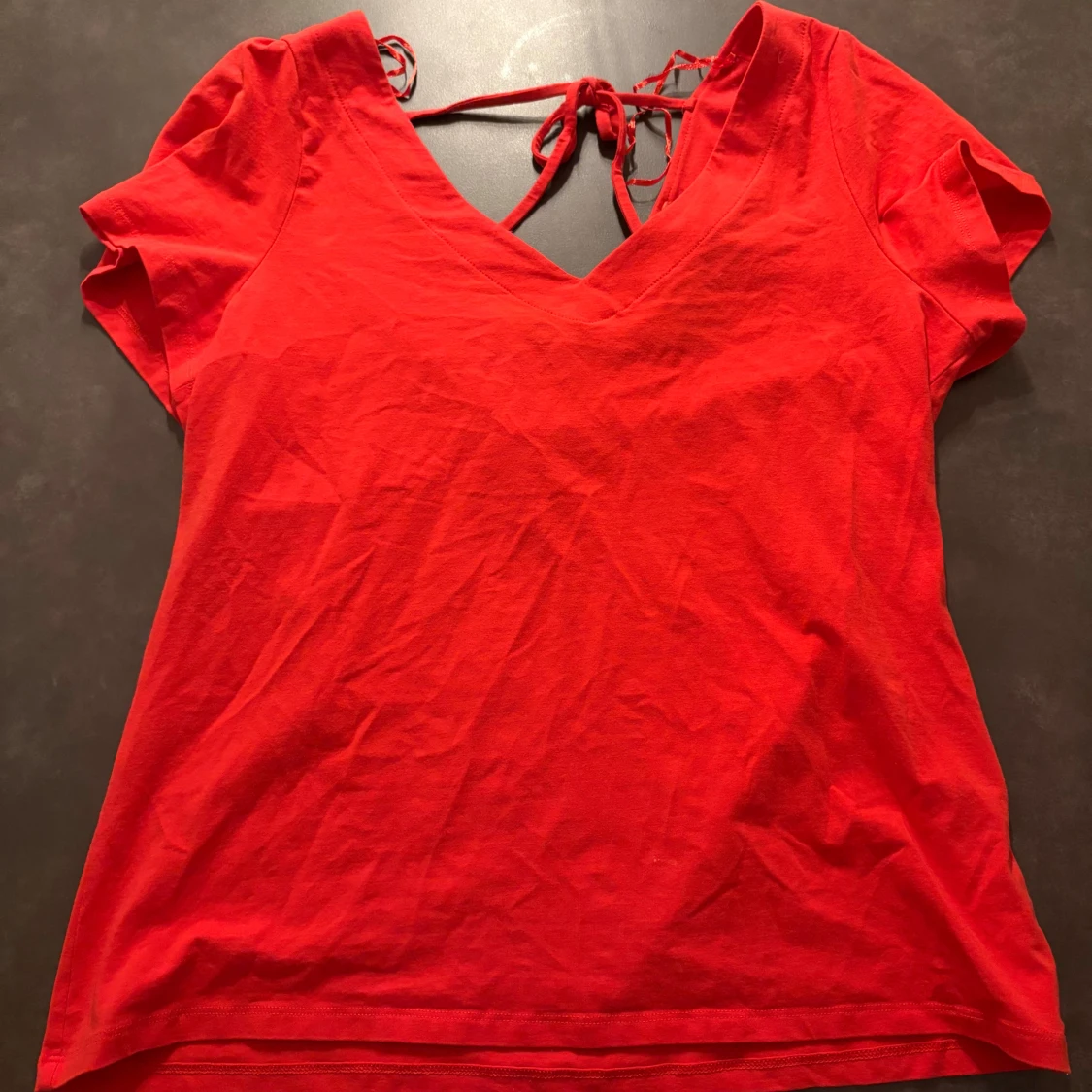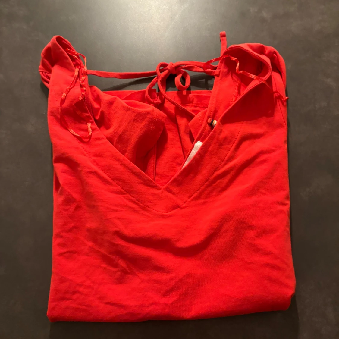 Röd kortärmad topp med v-ringning och snygg knytning i ryggen. Tillverkad i mjuk bomull och har en enkel, stilren design som passar perfekt till jeans eller kjol. Stolek L men passar till en M!