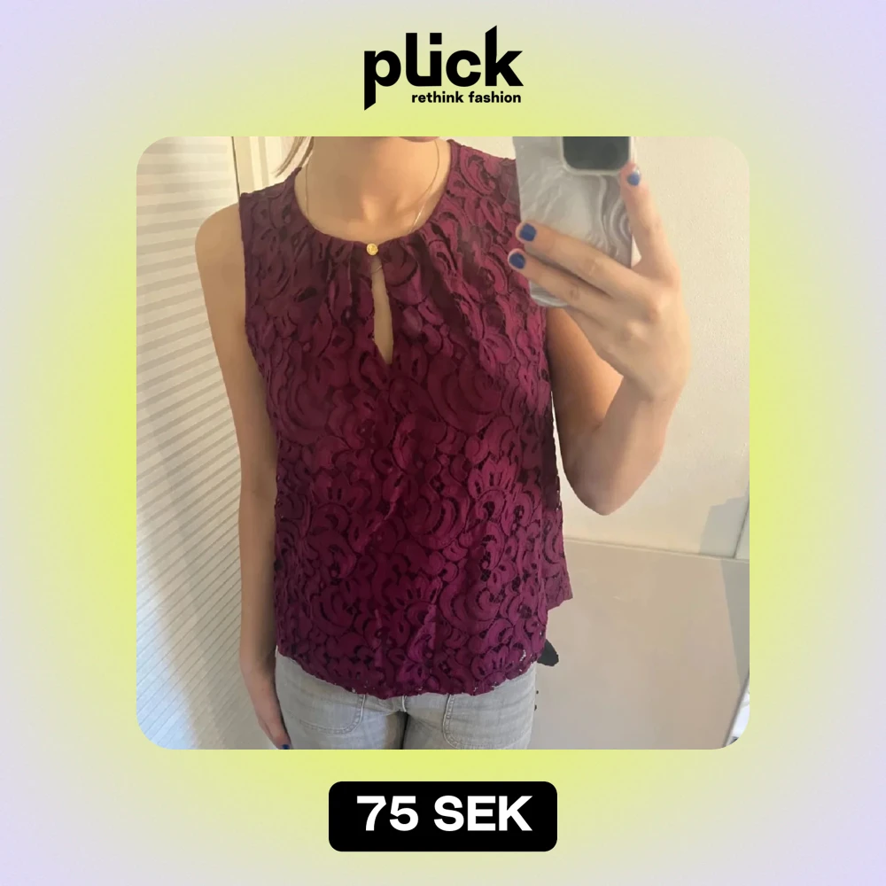 Säljer en elegant vinröd spetsblus med ett vackert mönster. Blusen är ärmlös och har en liten knappdetalj vid halsen. Perfekt för både fest och vardag! 💃