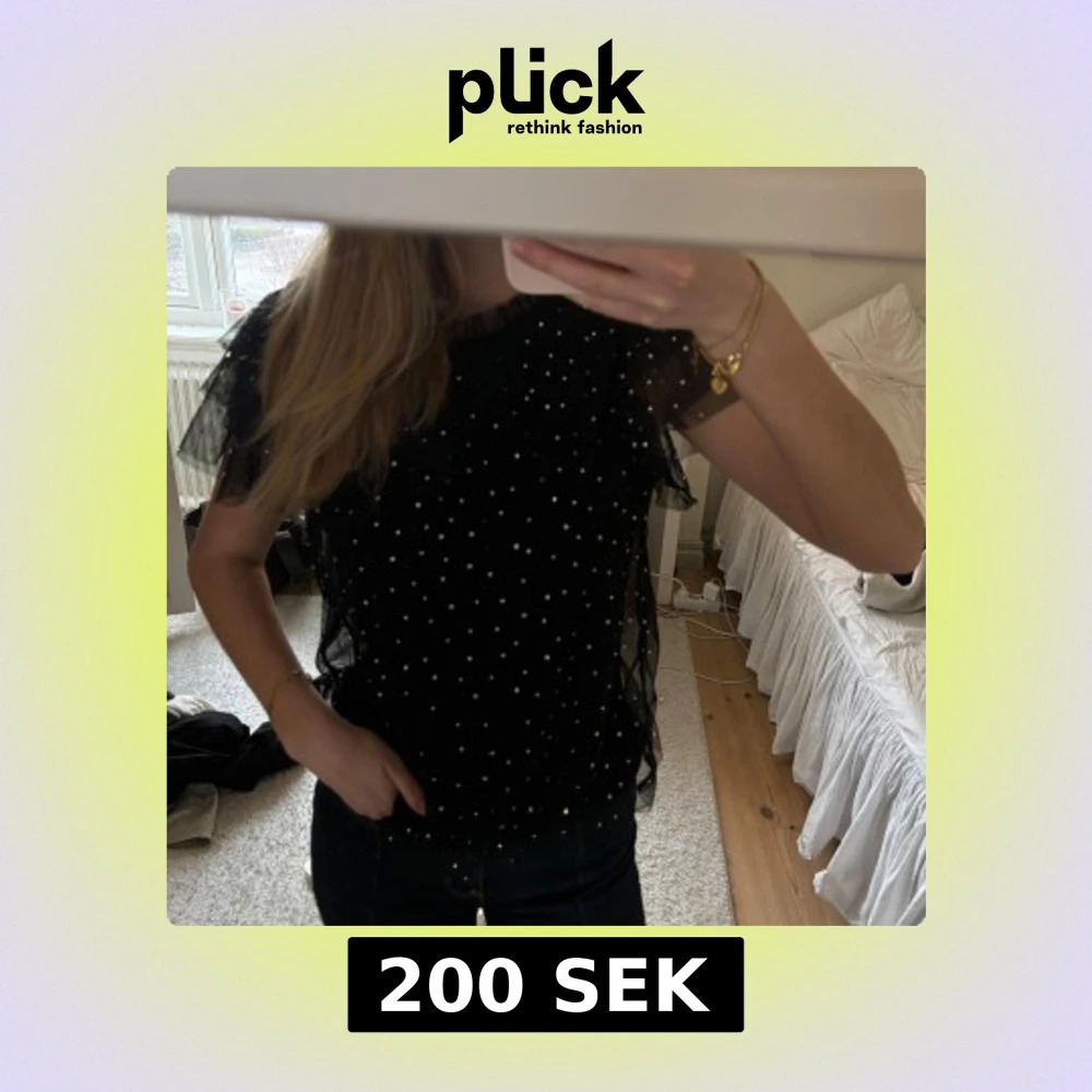 Säljer en svart blus med små diamant stenar på samt lite volanger på armarna. Endast använd en gång🫶🏼
